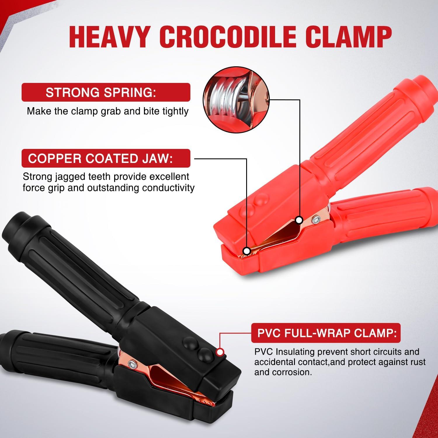 【High-quality materials】The conductor uses CCA copper-clad aluminum wire to ensure excellent conductivity; the alligator clips are made of copper-plated material, providing rust and corrosion resistance, and feature a serrated gripping structure with strong spring support, making them suitable for both top-mounted and side-mounted batteries.