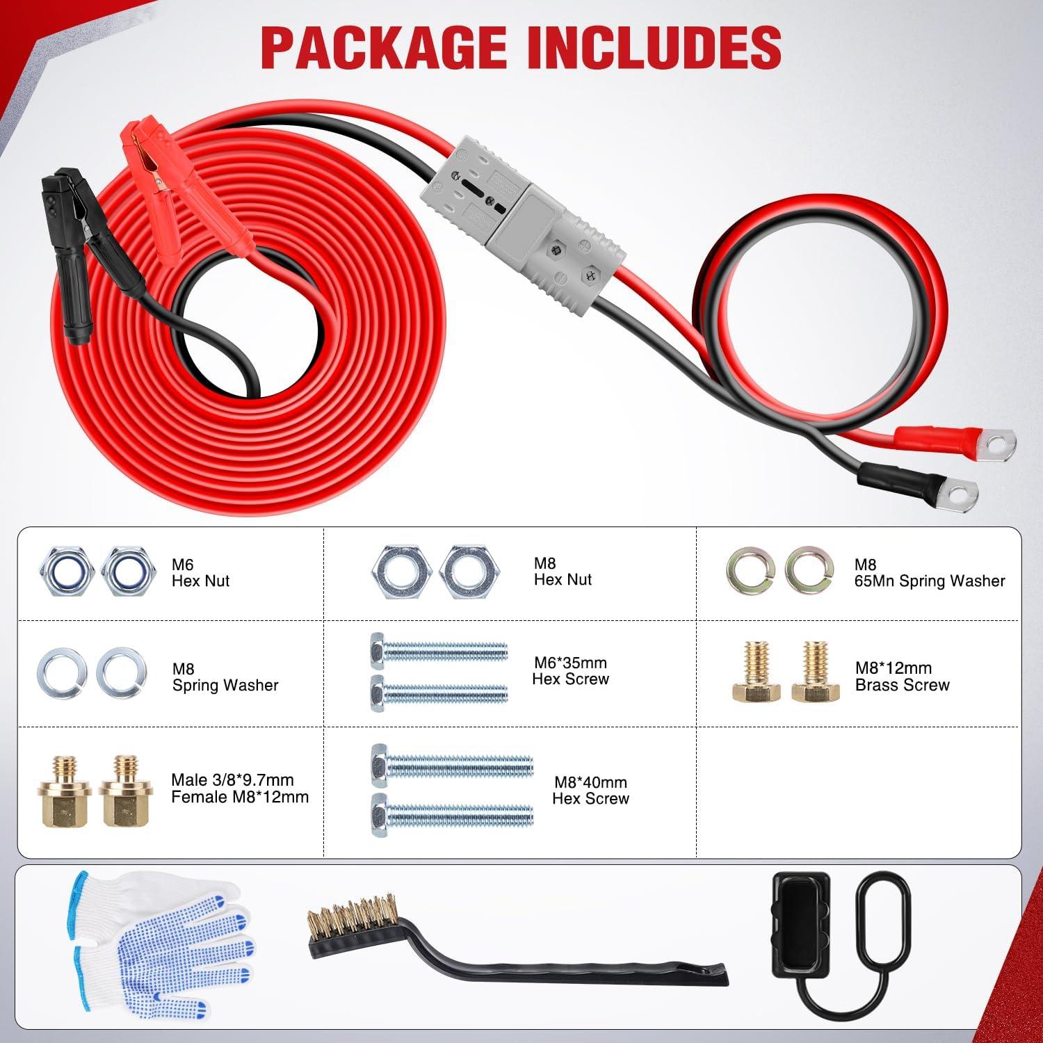 【Included Accessories】 1PC 0 Gange 30FT jumper cable,1PC carrying case,one pair of gloves, a bag of screws and fittings, and a brush.