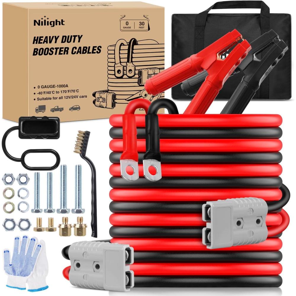 Nilight 0 Gauge 30 Feet Heavy Duty Jumper Cables 1000 Amp Booster Battery Cables with Permanent Installation kit and Quick Connect Plug Includes carrying bag for 12V & 24V Cars SUVs and Trucks(1 Guage 25 FT)
