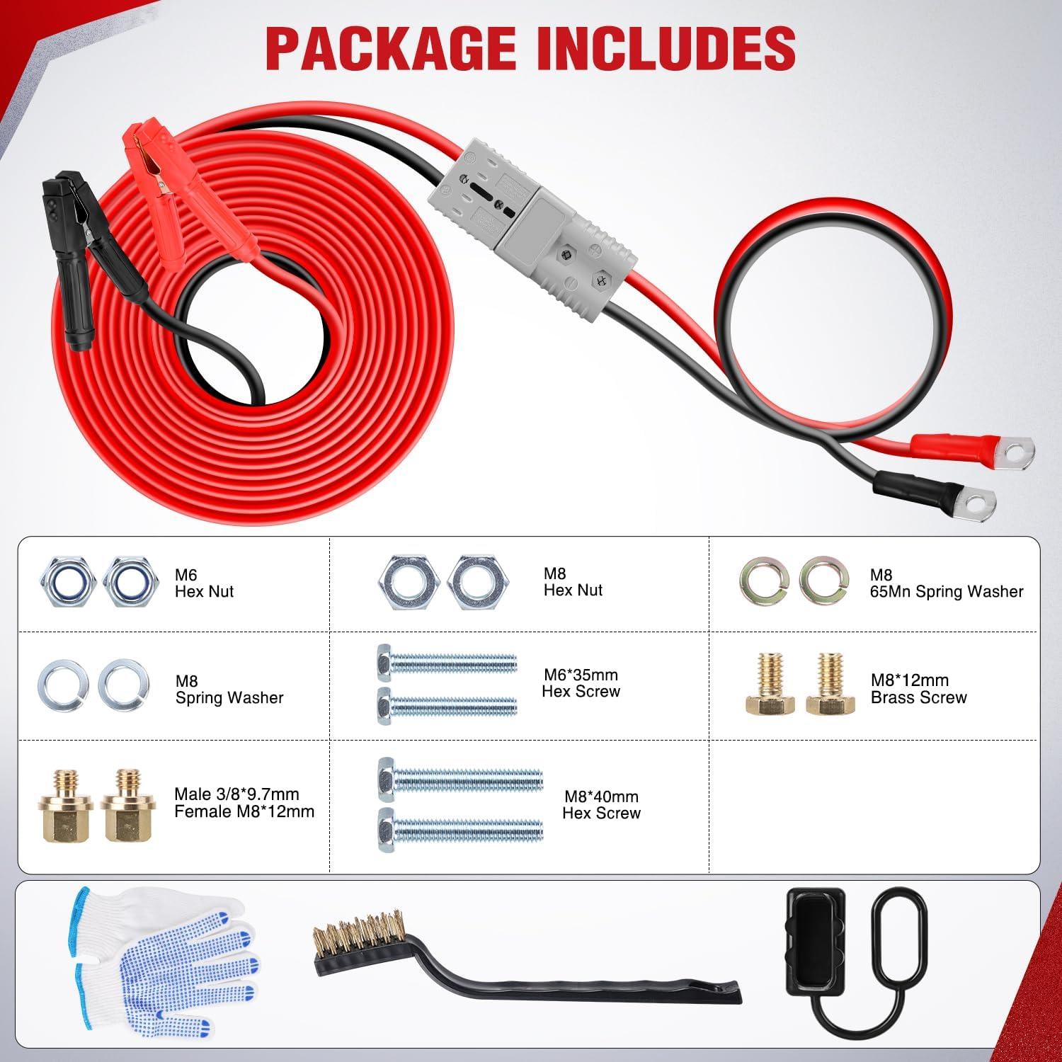 【Included Accessories】 1PC 0 Gange 30FT jumper cable,1PC carrying case,one pair of gloves, a bag of screws and fittings, and a brush.