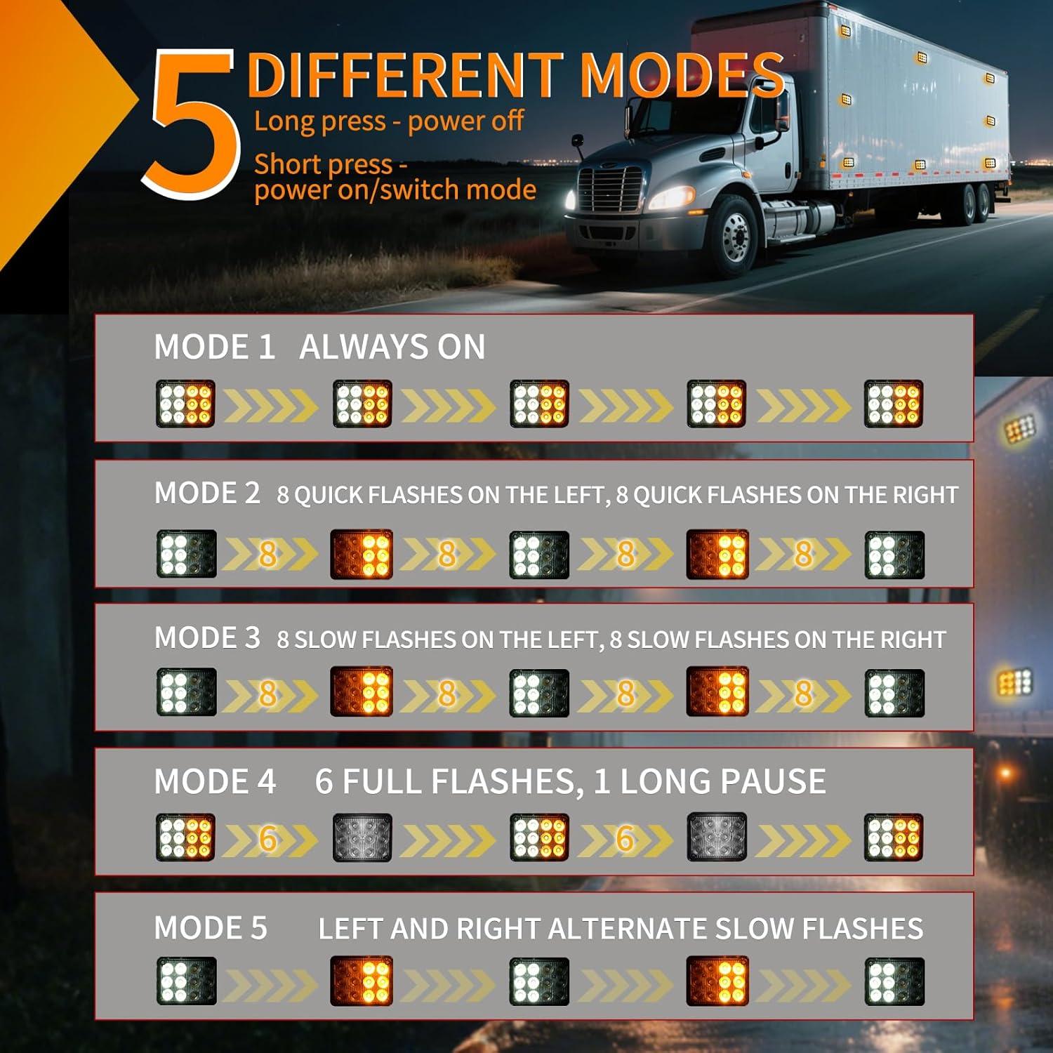 Versatile Modes: The 12LED trailer taillights feature 5 flashing modes and a convenient on/off button, providing multiple strobe modes to effectively warn other vehicles; simply use the red button to switch the flashing mode, press and hold for 2 seconds to control the light bar to turn off, with memory call mode.