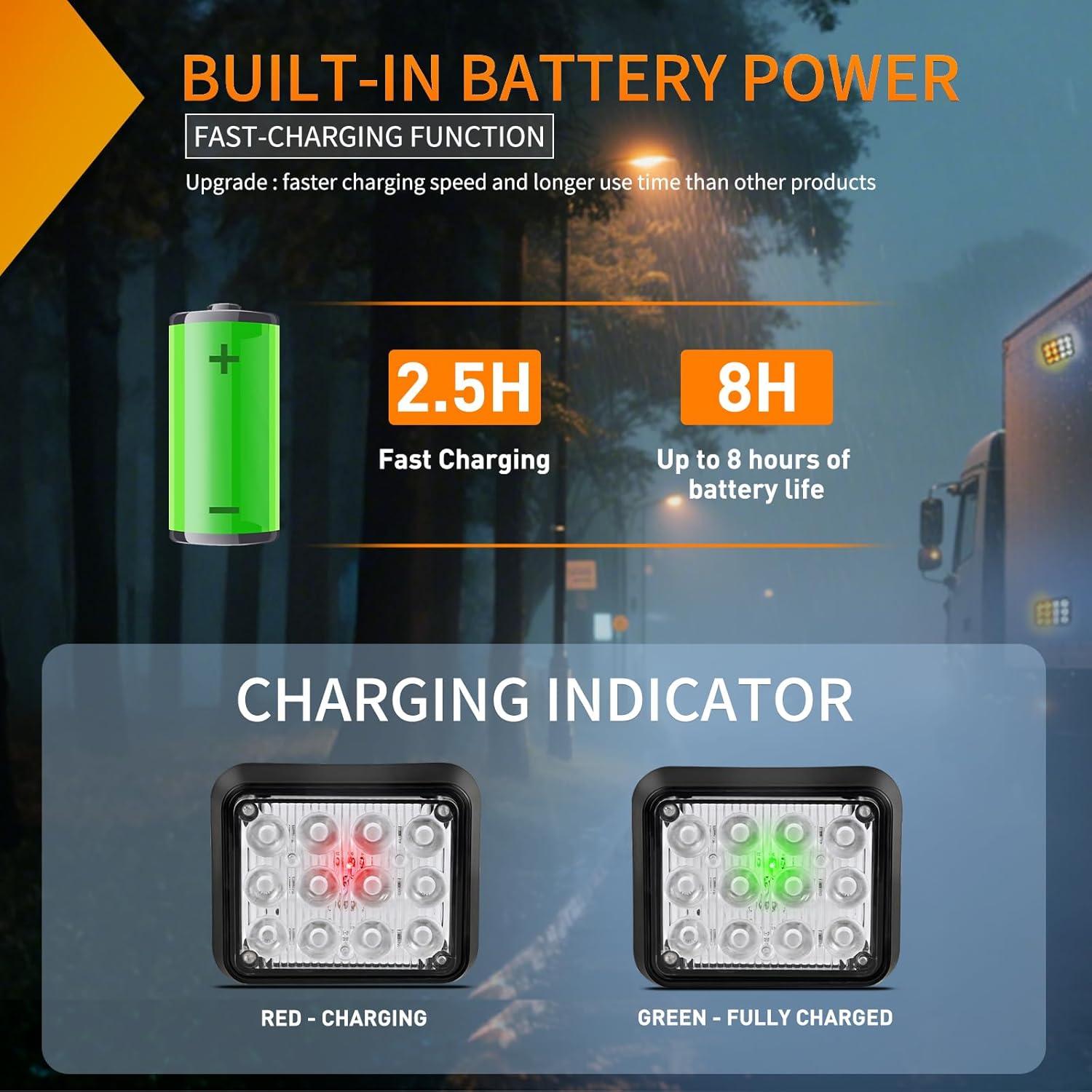 Long-Lasting: The wireless magnetic truck strobe light has a built-in battery that allows for up to 8 hours of continuous use on a single charge and features a fast-charge feature that fully charges the battery in just 2.5 hours.