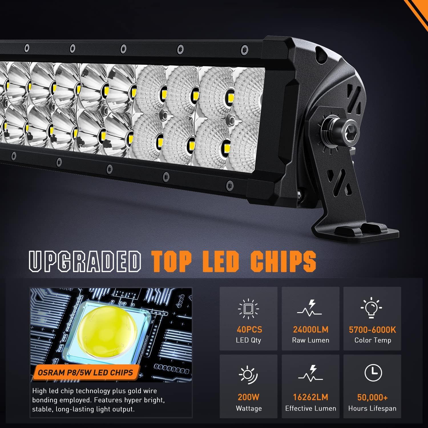 【Trusted Hyper Bright】Employ top-notch Osram P8/5W led chips, total 120 watts, with lighting performance 14400LM/PC, 2550Lux@10Meters, 1Lux@505Meters (1657FT). Features a trusted ultra-bright, high-intensity, stable light output. Improves driving safety with a clearer, wider, and further visual area. And lifespan extends over 50,000 hours