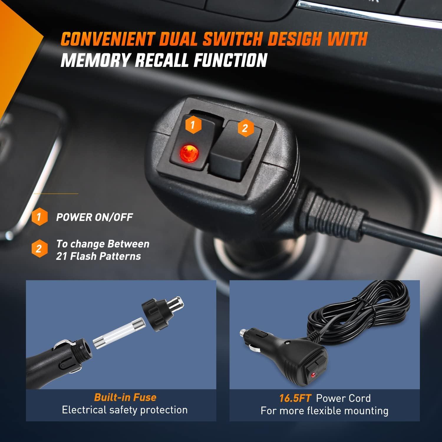 CIGAR LIGHTER POWER CORD – Comes with 16.5FT heavy duty power cord from light to cigarette lighter with a 12V cigarette plug.Dual switch design for power on/off and patterns switching, with last pattern recall / memorized function.