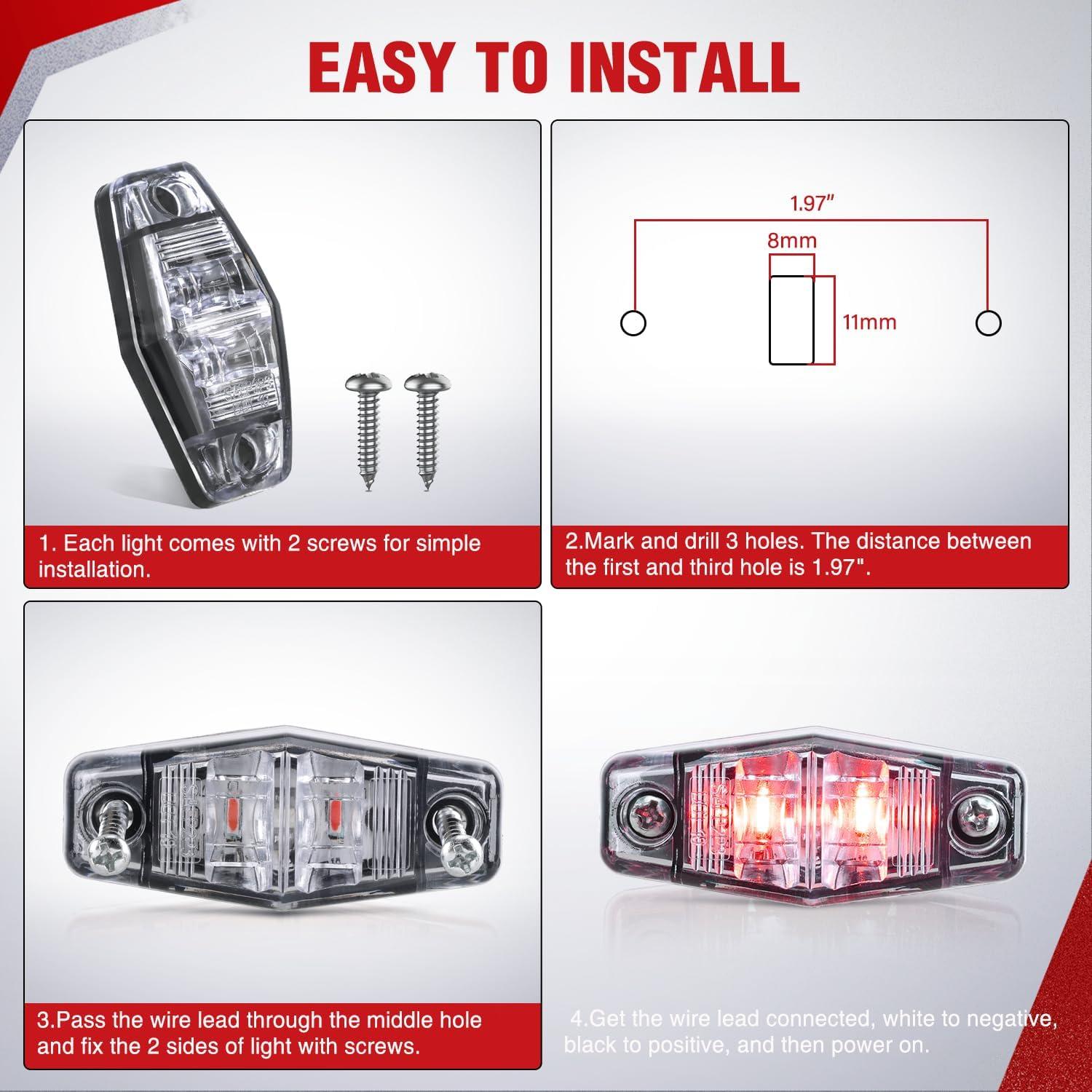 Package Included:Includes 8pcs red side marker lights with white lenses. Each light comes with 2 screws
