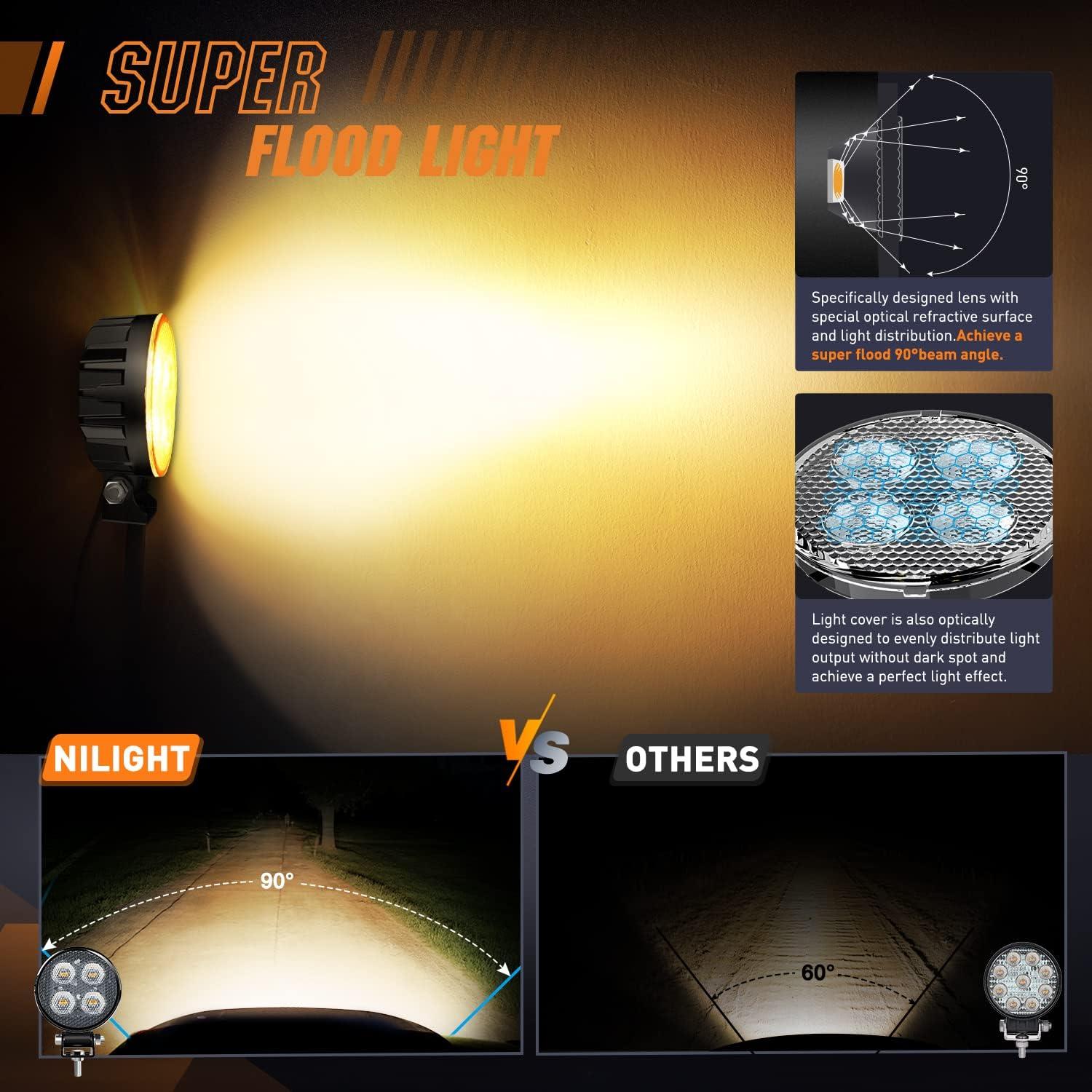 imageNilight 2 PCS 3 Inch LED Pods Round 1500LM Builtin EMC Work Light 90 Flood Beam Angle Offroad Side Lights w 16AWG DT Wiring Kit for Tractor Truck Boat ATV UTVAmber
