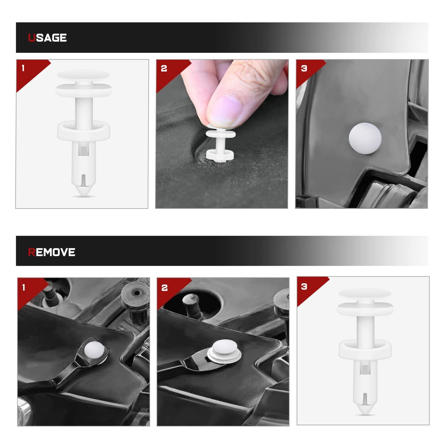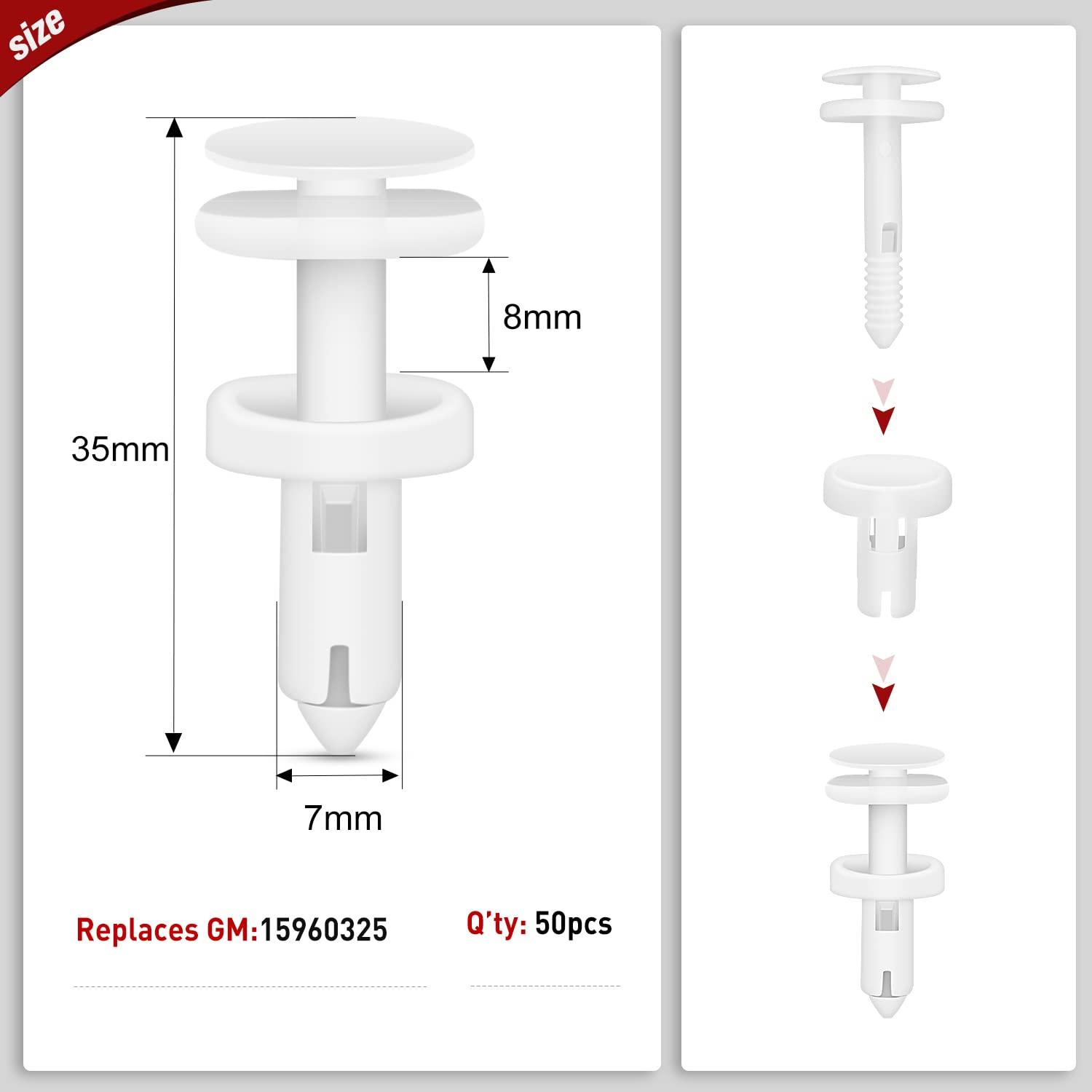 Package Includes: 30 x 6mm Bumper Clips Head Diameter: 15mm Stem Length: 11mm Fits: 6mm hole 30 x 7mm Push Retainer Clips Head Diameter: 18.65mm Stem Length: 22mm Fits: 7mm hole 50 x 8mm Fastener Rivet Clips Head Diameter: 20mm Stem Length: 22mm Fits: 8mm hole 30 x 8mm Push type Clips Head Diameter: 20mm Stem Length: 9mm Fits: 8mm hole 30 x 9mm Push-Type Automotive Clips Head Diameter: 18.3mm Stem Length: 28mm Fits: 9mm hole 30 x 10mm Nylon Bumper Clips Head Diameter: 20mm Stem Length: 13mm Fits: 10mm hole Suitable Car Model Reference: Replaces GM: 21030249; Ford: N807389S; Chrysler: 6503598 Replaces Toyota: 52161-16010, 52161-02020 Replaces Honda & Acura : 91503-SZ3-003 Replaces Honda: 90683-SA5-003 Replaces GM: 1595864, 1605396; Chrysler: 6030441; Ford: 388577S, W705589-S300 Replaces Nissan: 01553-09321