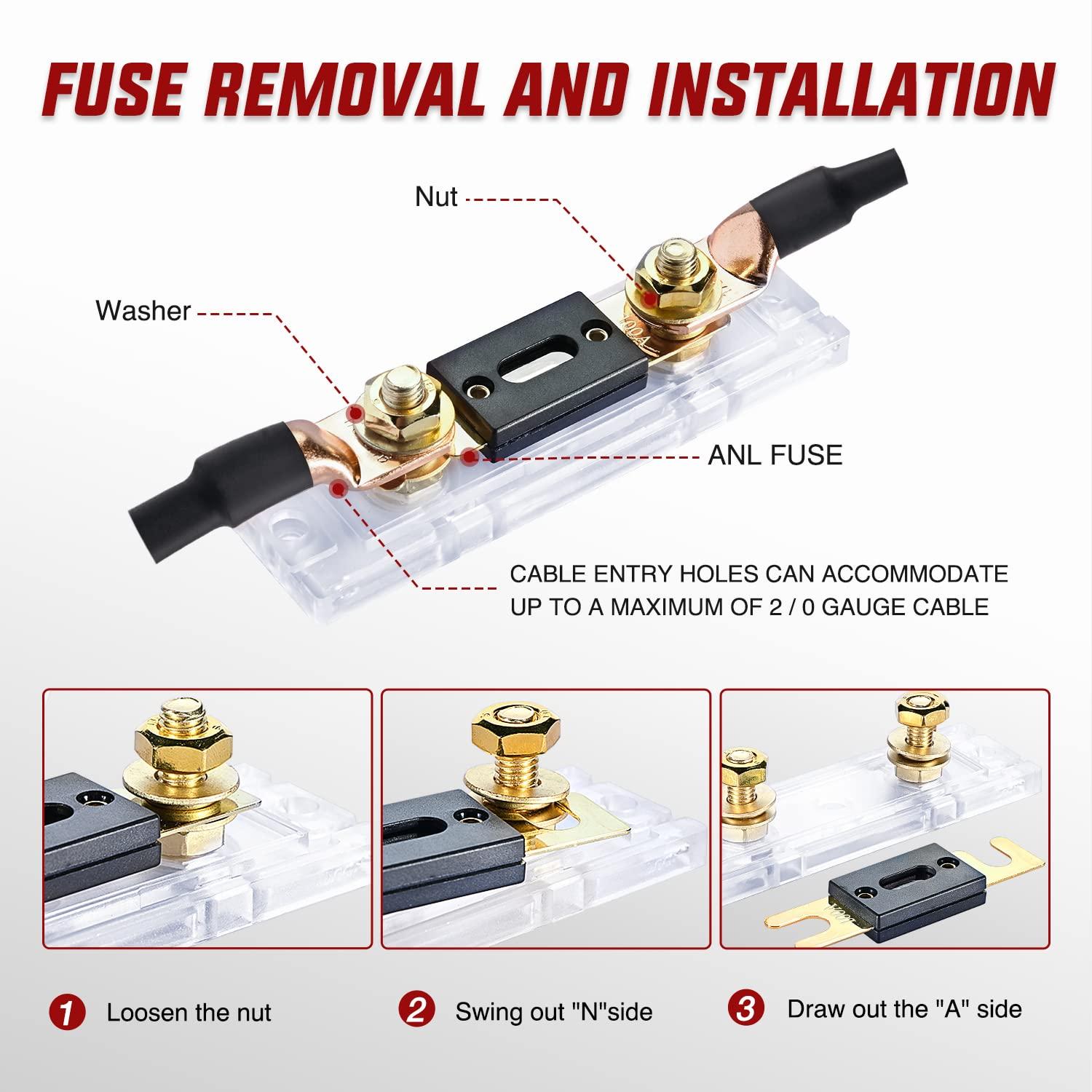 High Quality : Our ANL fuse is made of copper alloy and gold plating on the surface, durable and reliable to use, heat resistant, melting resistance and good conductivity, clear cover and holder features transparent design, allow you to visually see the operation of the fuse, waterproof cover protect the internal fuses from water and further damage.