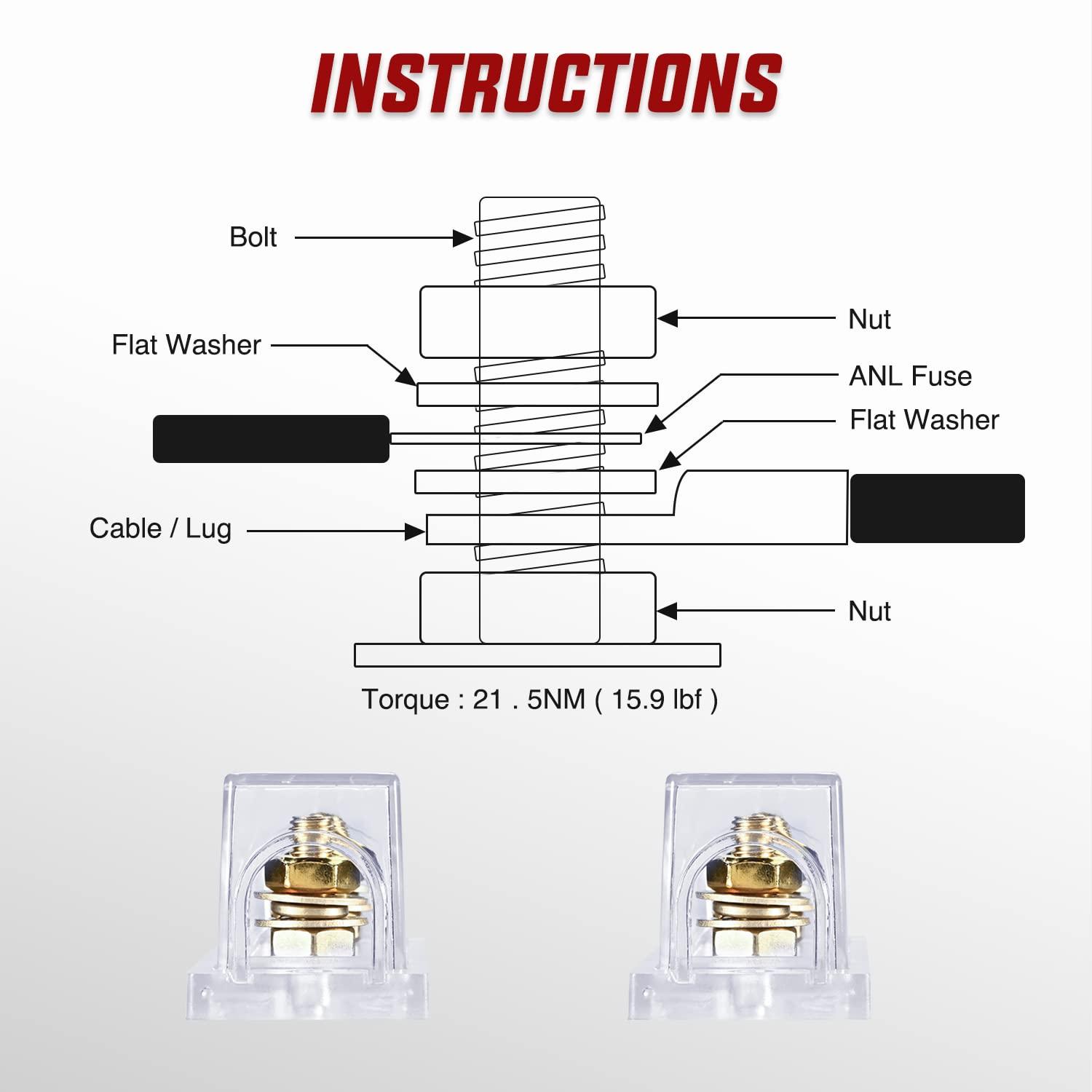 Stud Size: ANL Fuse Holder mounting bolts are 8 mm(5/16″) in diameter. which is the size of commonly used terminals to achieve a proper connection to the the ANL Fuse Holder. This package includes 4 PCS 5/16″ Copper Lugs with Heat Shrink Tubing which are safe and reliable, and great for this ANL fuse holder. It can securely hold the fuse and use it with 1/0,2,4 AWG Ring Terminals.