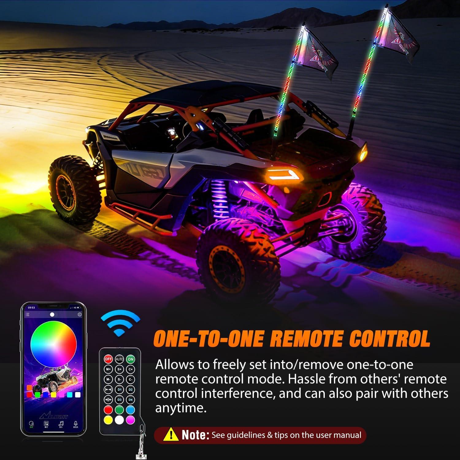 Nilight 2PCS 3FT RGB LED Whip Light with Spring Base and 6 PCS Rock Lights Combo, Remote App Control w/DIY Chasing Patterns Turn Signal Brake Reverse Antenna Lighted Whips for ATV UTV Polaris RZR Jeep(4FT -2PCS)