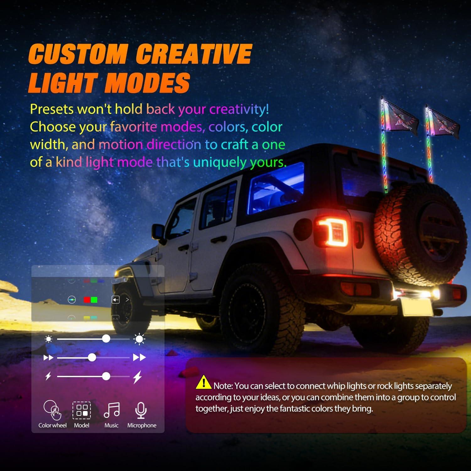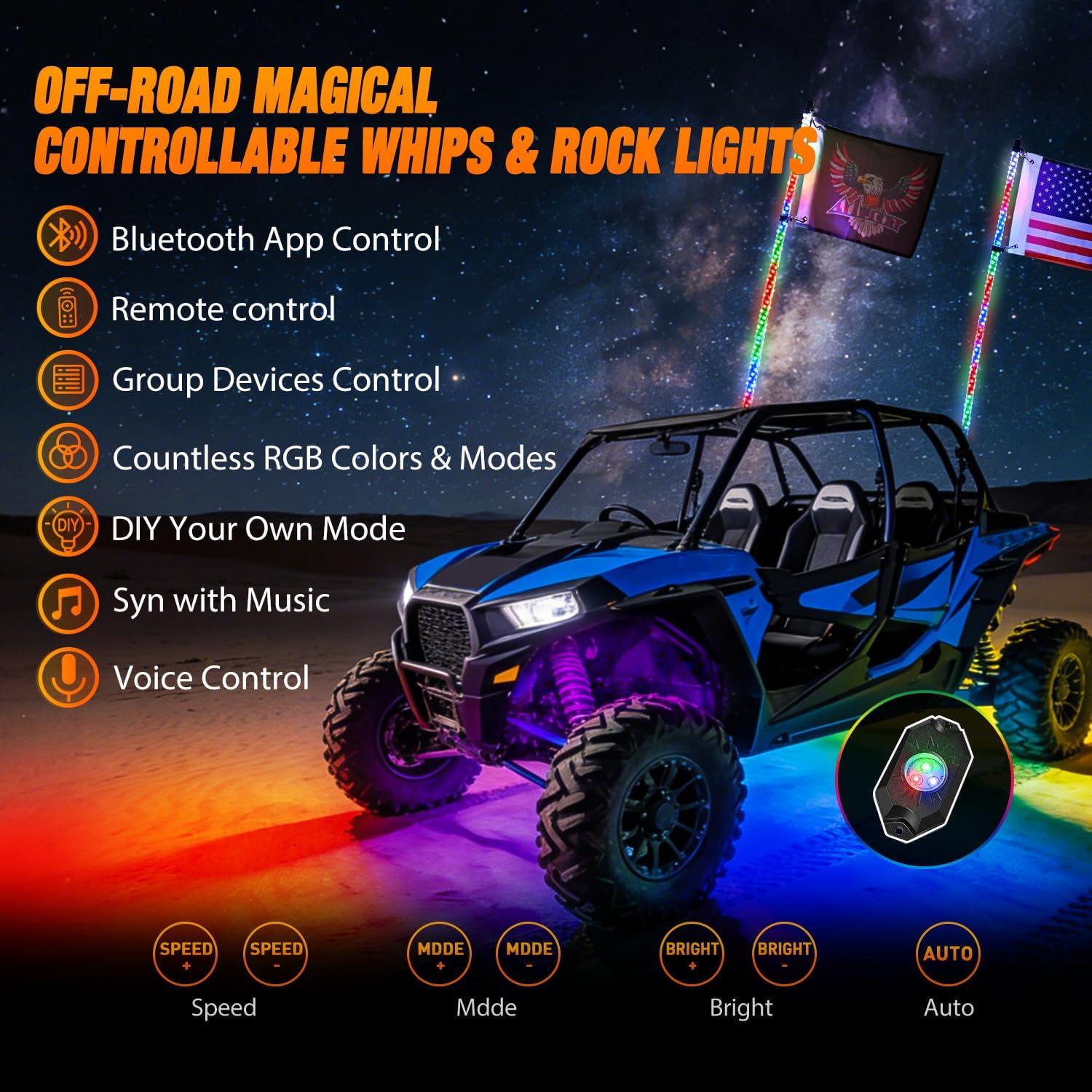 DIY Customization & 360° Spiral Design: Break away from factory presets by creating your own unique lighting effects. Featuring a 360° glowing spiral design and 200% enhanced brightness, this kit ensures you stand out on the trail. The system allows for synchronous control, perfectly matching the whip lights with the rock lights for a unified, dazzling look