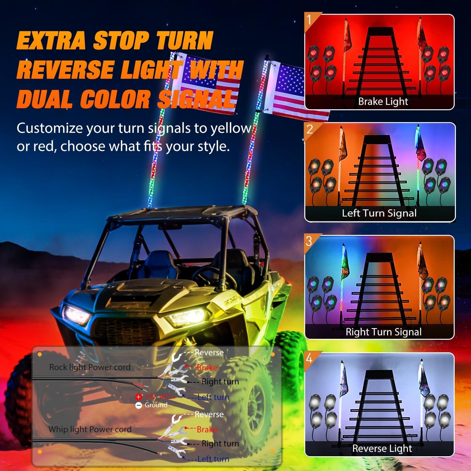 Advanced Safety Signaling: Built for safety as well as style, these whips function as auxiliary running lights. They automatically switch to specific colors for vehicle maneuvers: Red for braking, Amber for turn signals, and White for reverse/backup, providing crucial visibility to other riders in low-light conditions