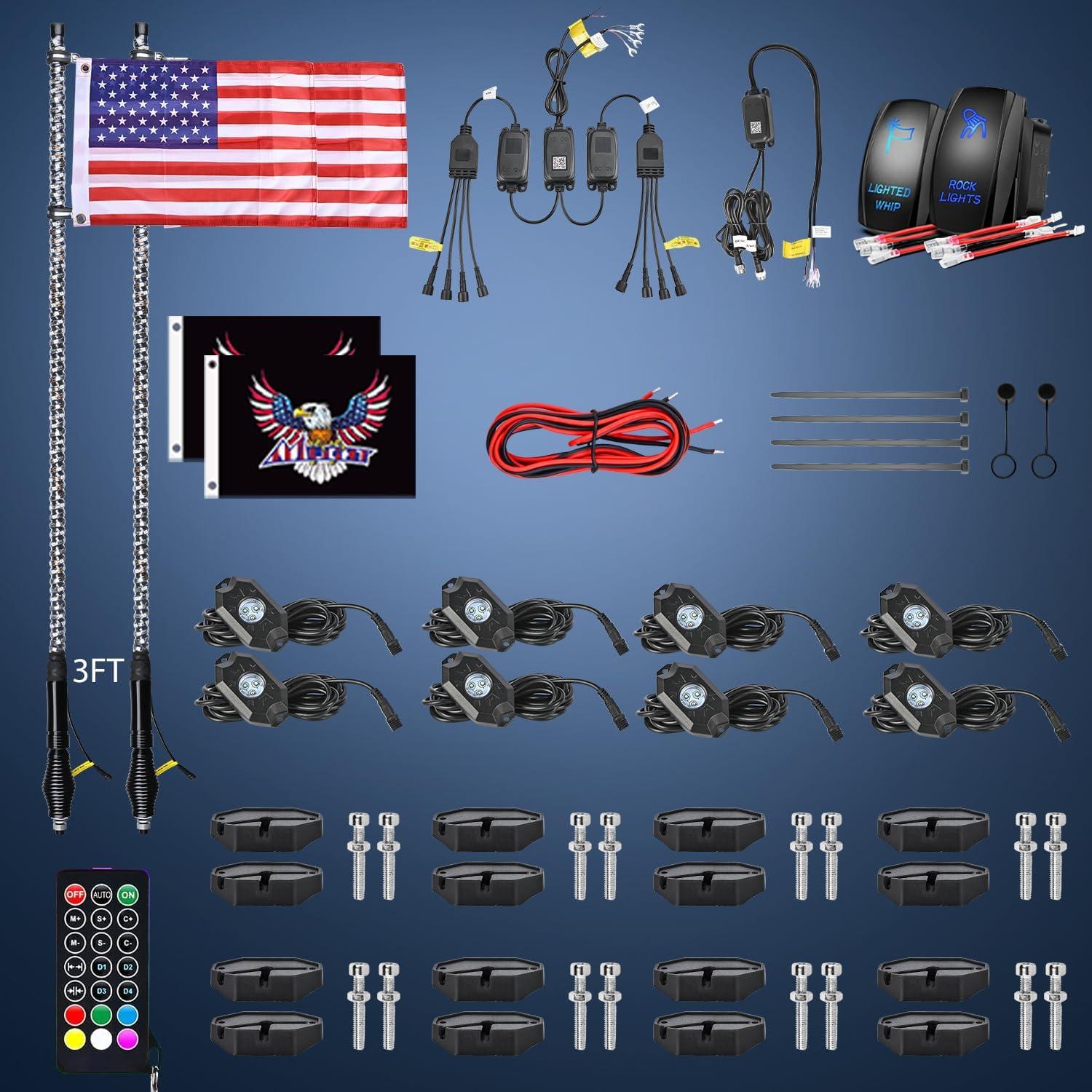 Nilight 2PCS 3FT RGB LED Whip Light with Spring Base and 6 PCS Rock Lights Combo, Remote App Control w/DIY Chasing Patterns Turn Signal Brake Reverse Antenna Lighted Whips for ATV UTV Polaris RZR Jeep(3FT + 8Pcs Rock Lights)