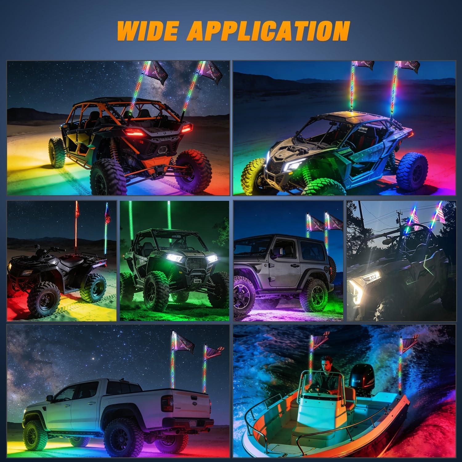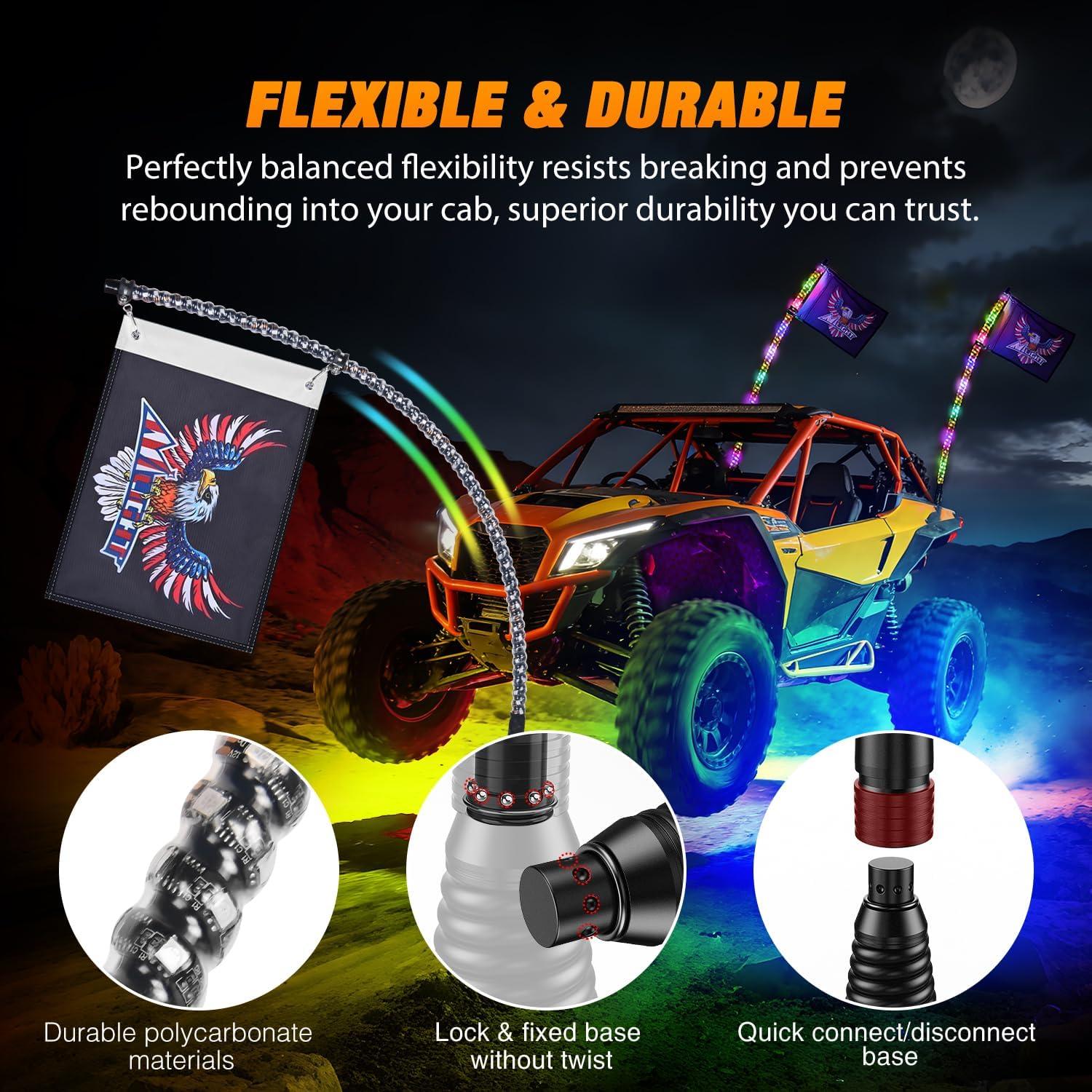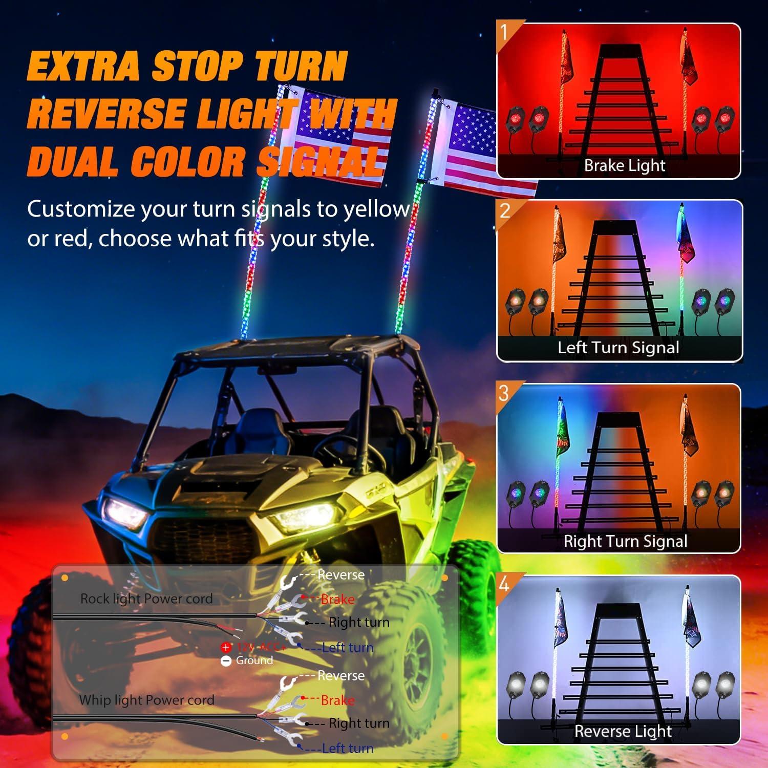Advanced Safety Signaling: Built for safety as well as style, these whips function as auxiliary running lights. They automatically switch to specific colors for vehicle maneuvers: Red for braking, Amber for turn signals, and White for reverse/backup, providing crucial visibility to other riders in low-light conditions