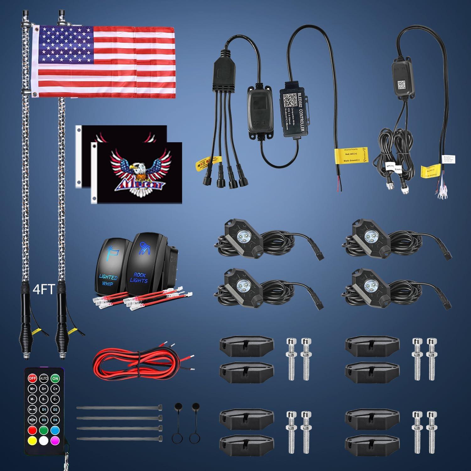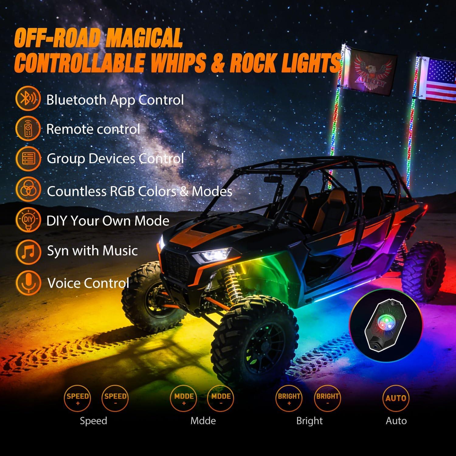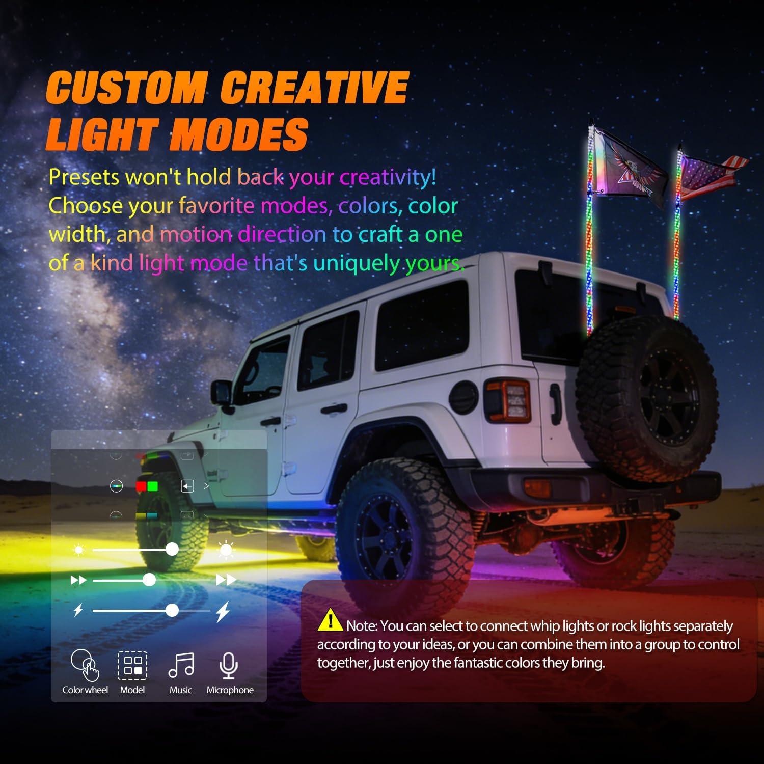 DIY Customization & 360° Spiral Design: Break away from factory presets by creating your own unique lighting effects. Featuring a 360° glowing spiral design and 200% enhanced brightness, this kit ensures you stand out on the trail. The system allows for synchronous control, perfectly matching the whip lights with the rock lights for a unified, dazzling look