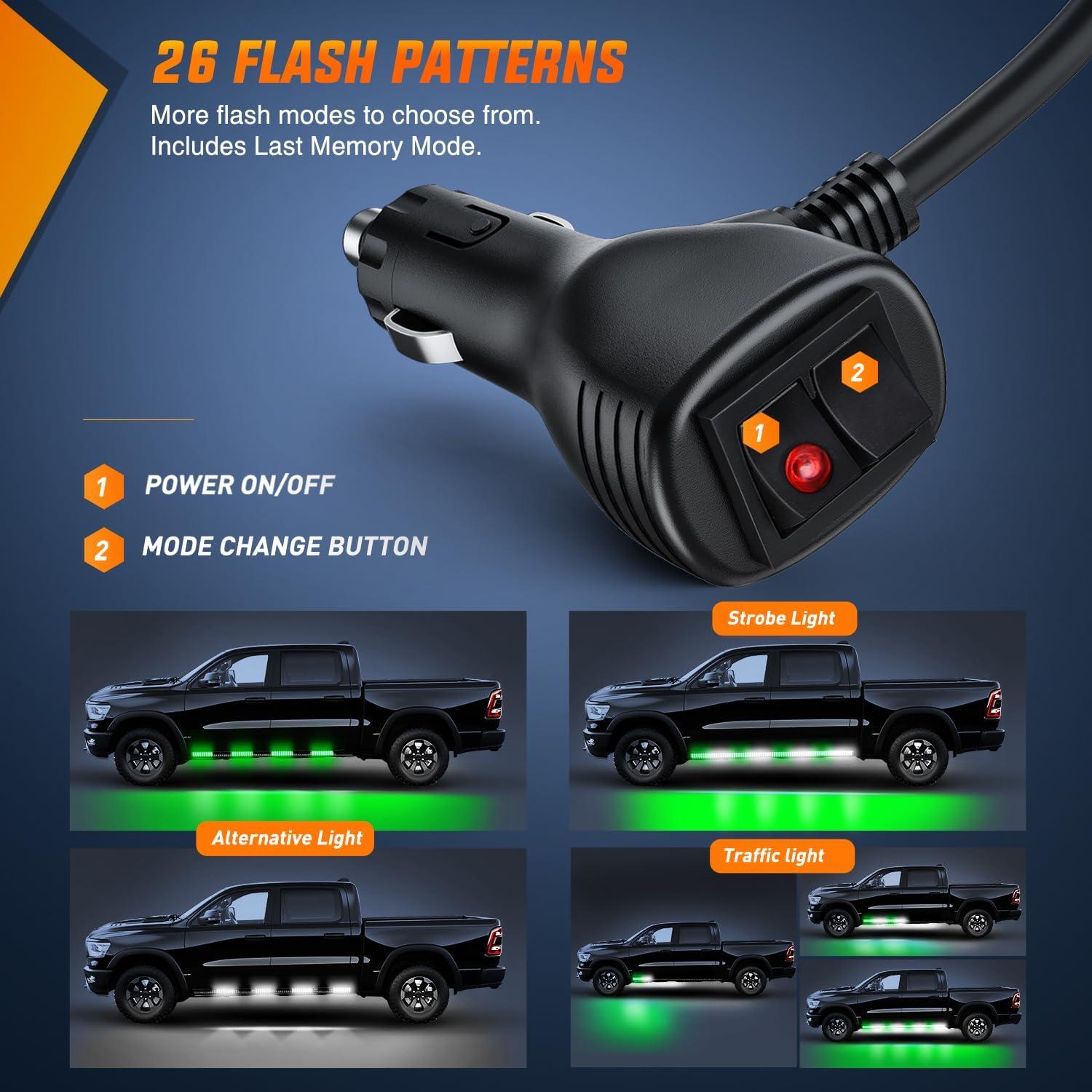26 Flash Modes: The product has 26 different strobe light modes, plug in the 12V cigarette lighter switch(12V only), control the desired strobe mode through the cigarette lighter switch, switch to the mode you need to use the scene mode, and has a memory function.
