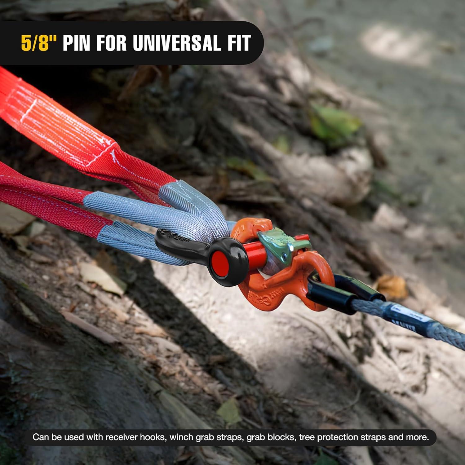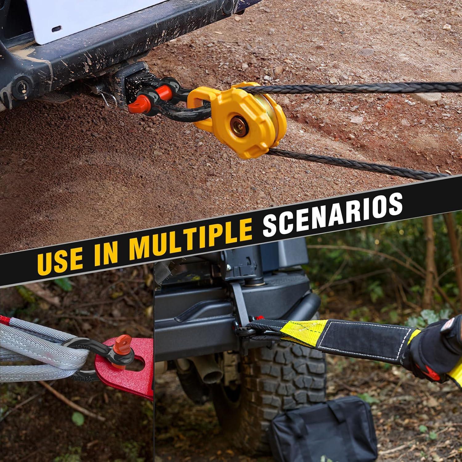 【 UNIVERSAL D RING SHACKLES 】 – 3/4″ d-ring shackles 4.75 Ton (9,500 Lbs),with a Towing Pulley, an Industry Standard 7/8″ Screw Pin , and an outer nut that avoids fall. The insurance pin provides additional protection.
