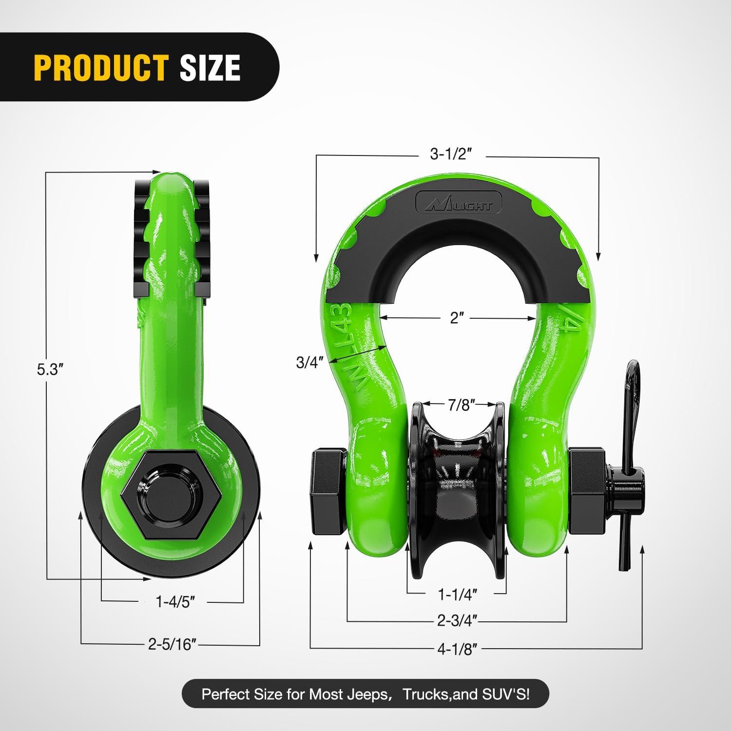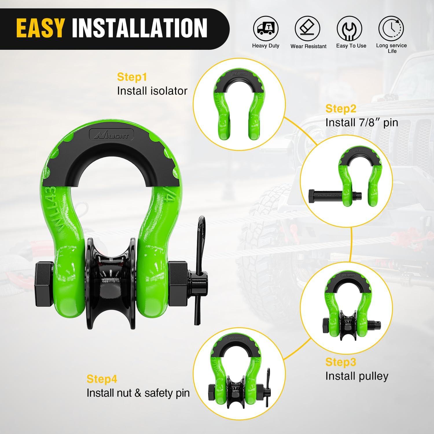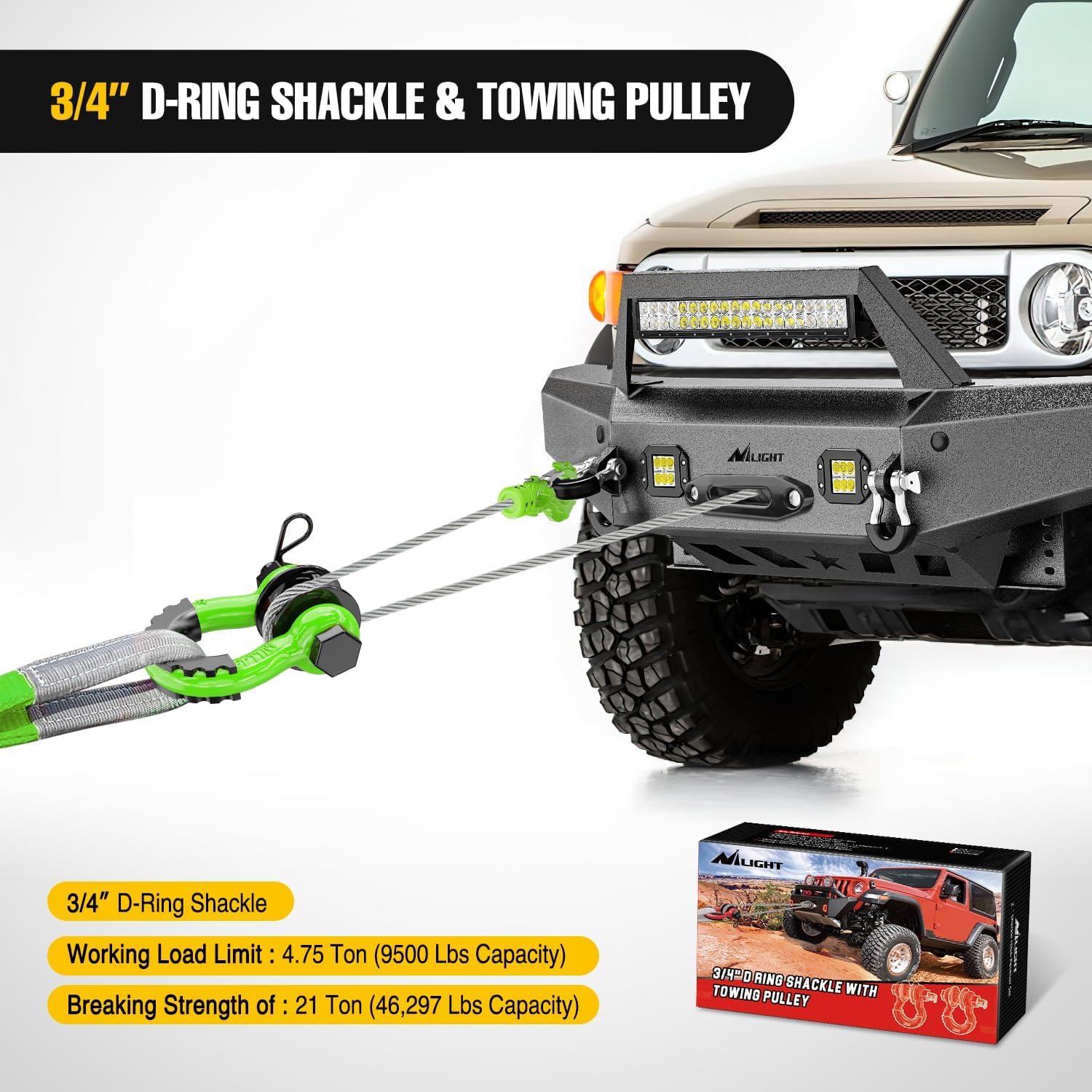 Nilight 3/4″ D Ring Shackle with Towing Pulley 2 Pack 4.75 Ton (9500 Lbs) 7/8″ Pin Heavy Duty Off Road Recovery Shackle with Isolators Washer Kit for Jeep Truck Tractor Vehicle ATV UTV, Green(Green)