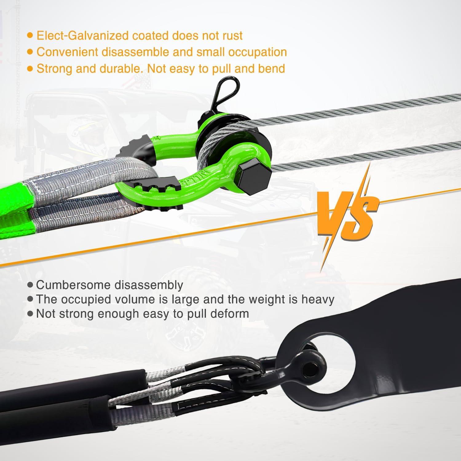 【 UNIVERSAL D RING SHACKLES 】 – 3/4″ d-ring shackles 4.75 Ton (9,500 Lbs),with a Towing Pulley, an Industry Standard 7/8″ Screw Pin , and an outer nut that avoids fall. The insurance pin provides additional protection.