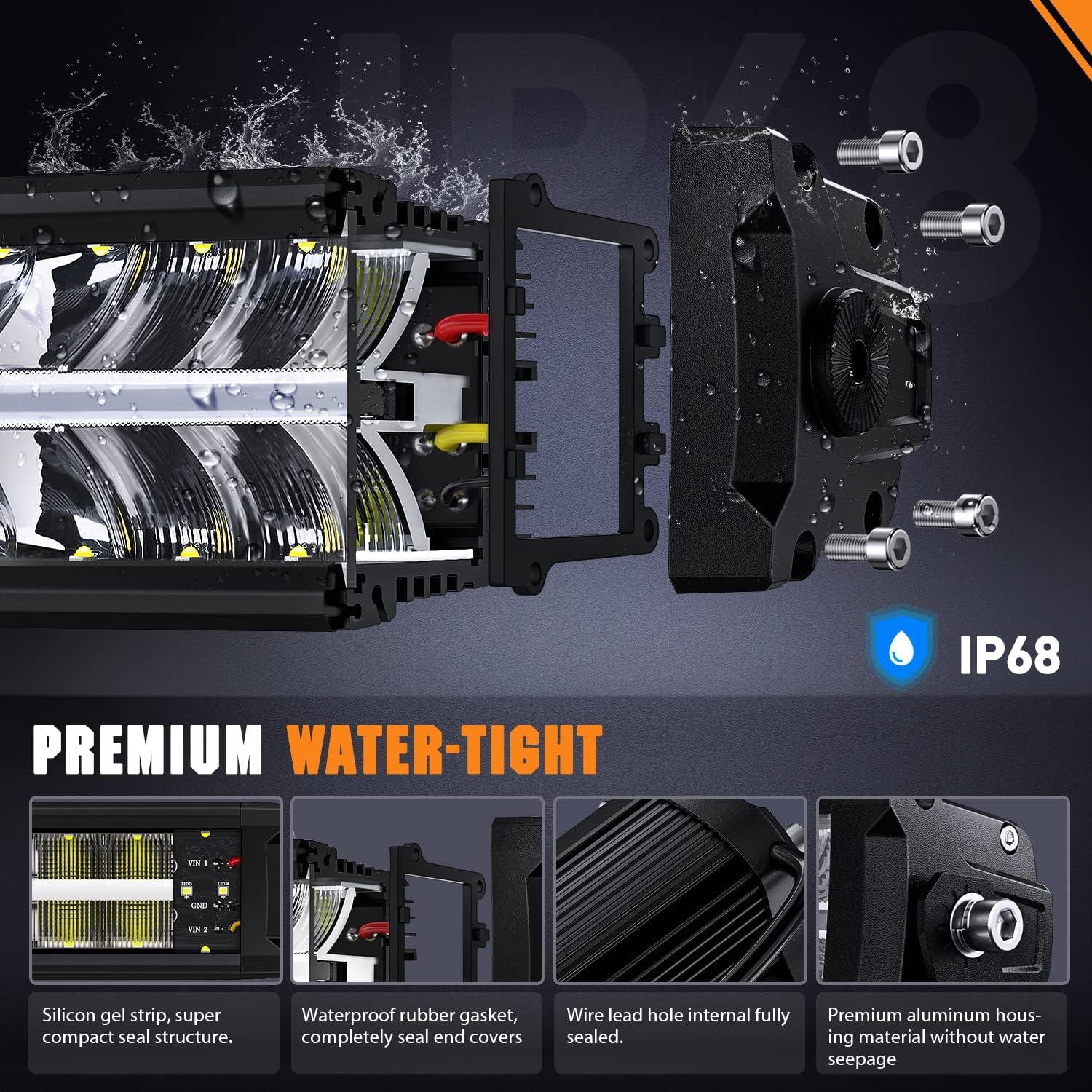 【Trusted Hyper Bright】Employ top-notch Osram P8/5W led chips, total 240 watts per light, with lighting performance 24800LM/PC, 6200Lux@10Meters, 1Lux@787Meters (2582FT). Features a trusted ultra-bright, high-intensity, stable light output. Improves driving safety with a clearer, wider, and further visual area. Lifespan extends over 50,000 hours