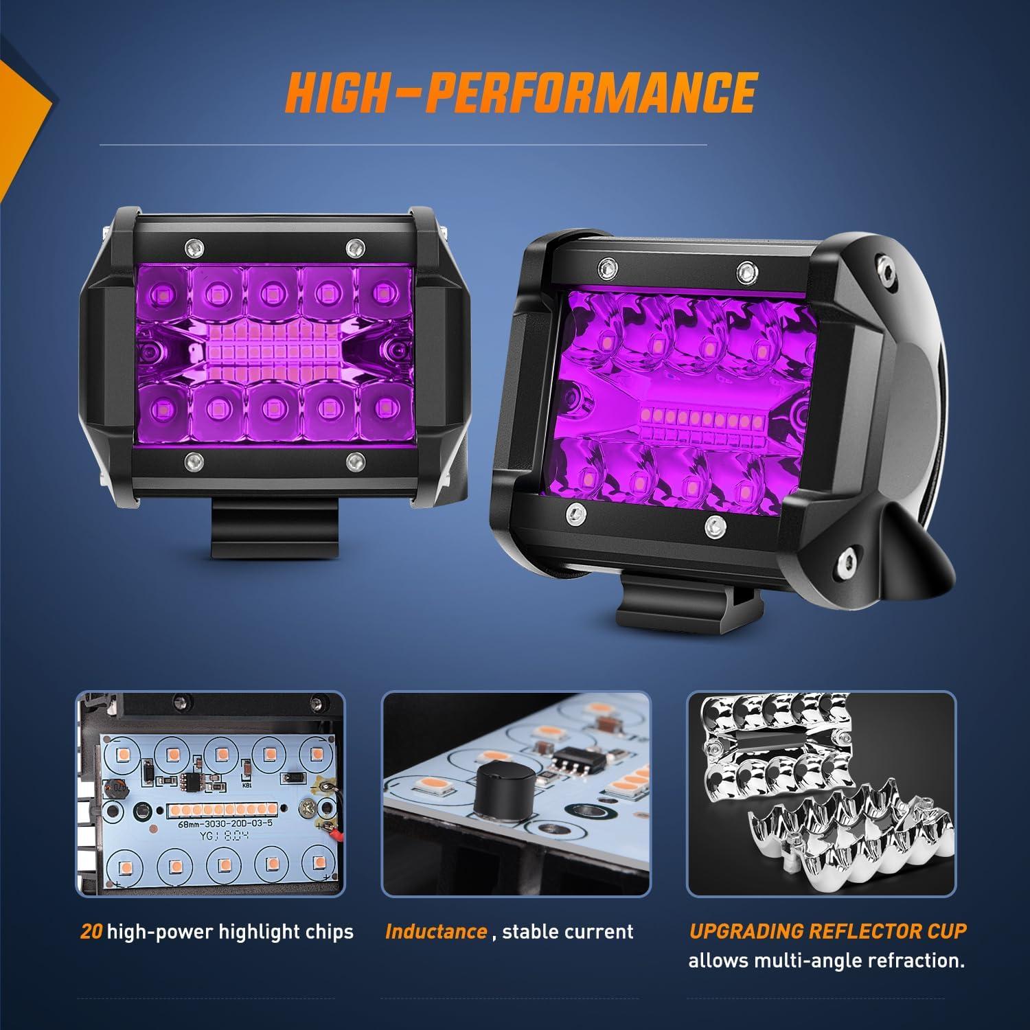 Purple Super Bright Combo Beam: Adopted 20pcs 3w chips, appropriate combination of spot beam and flood beam for wide spread and further distance illumination, allowing you to see the front and rear cars clearly in bad weather such as night or heavy fog, light up your night hunting, night ride or any other night activities