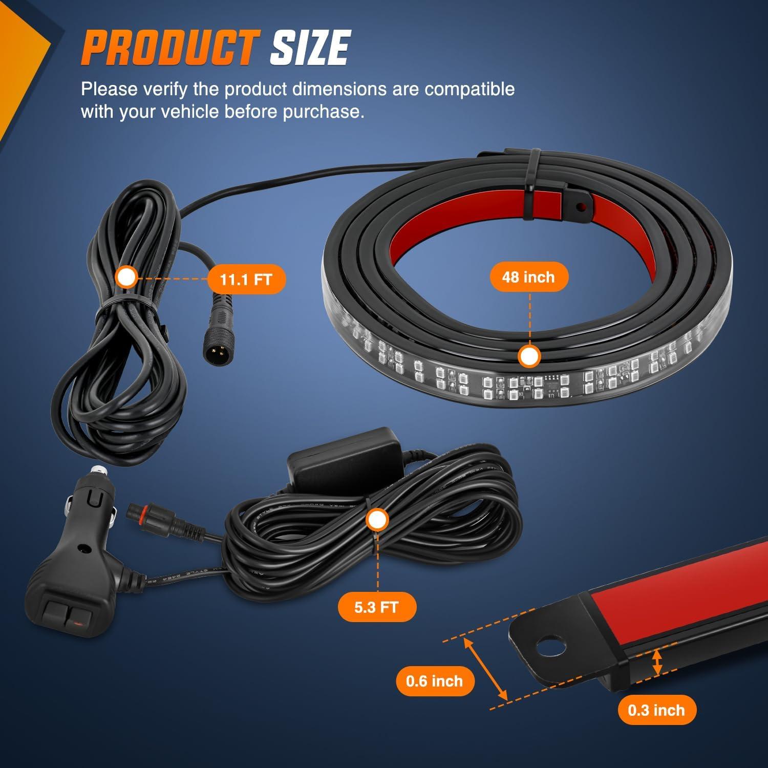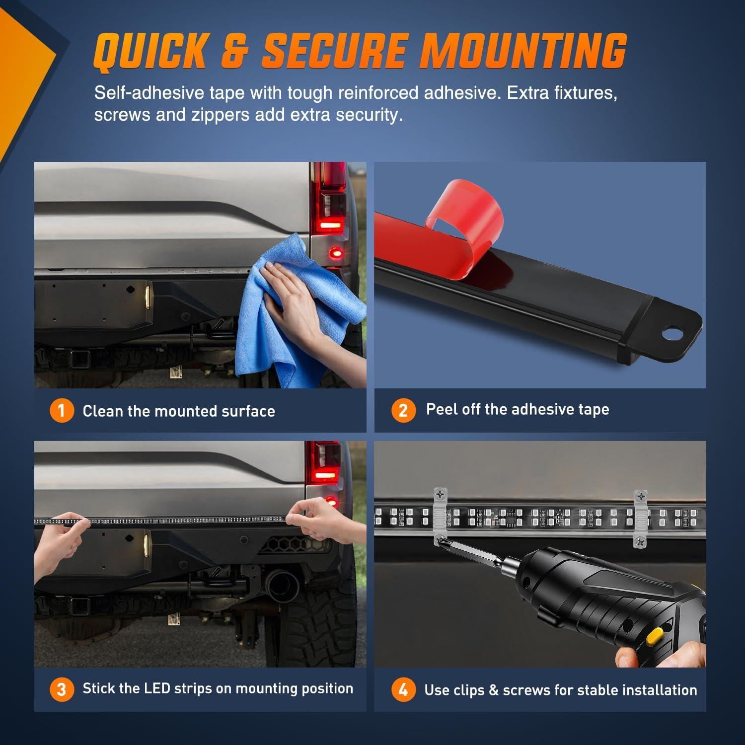 Easy Installation: Just clean the surface, peel and stick the light strip. Reinforced with heavy-duty adhesive and cable ties, it stays rock-solid even in rain, at highway speeds, or on bumpy off-road trails