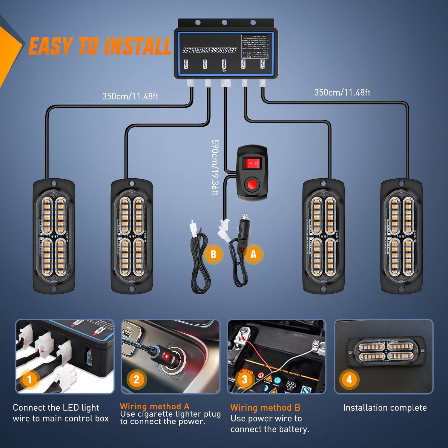 Applications: This strobe light is suitable for any 12-24V vehicle such as trucks, construction vehicles, tractors, snowplows, SUVs, campers, trailers etc. It can be mounted on any surface of the car such as the sides, grille in front of the vehicle, and rear of the car. Package includes: 4pcs LED Strobe Lights, 4pcs Rubber Mats, 8x Mounting Screws
