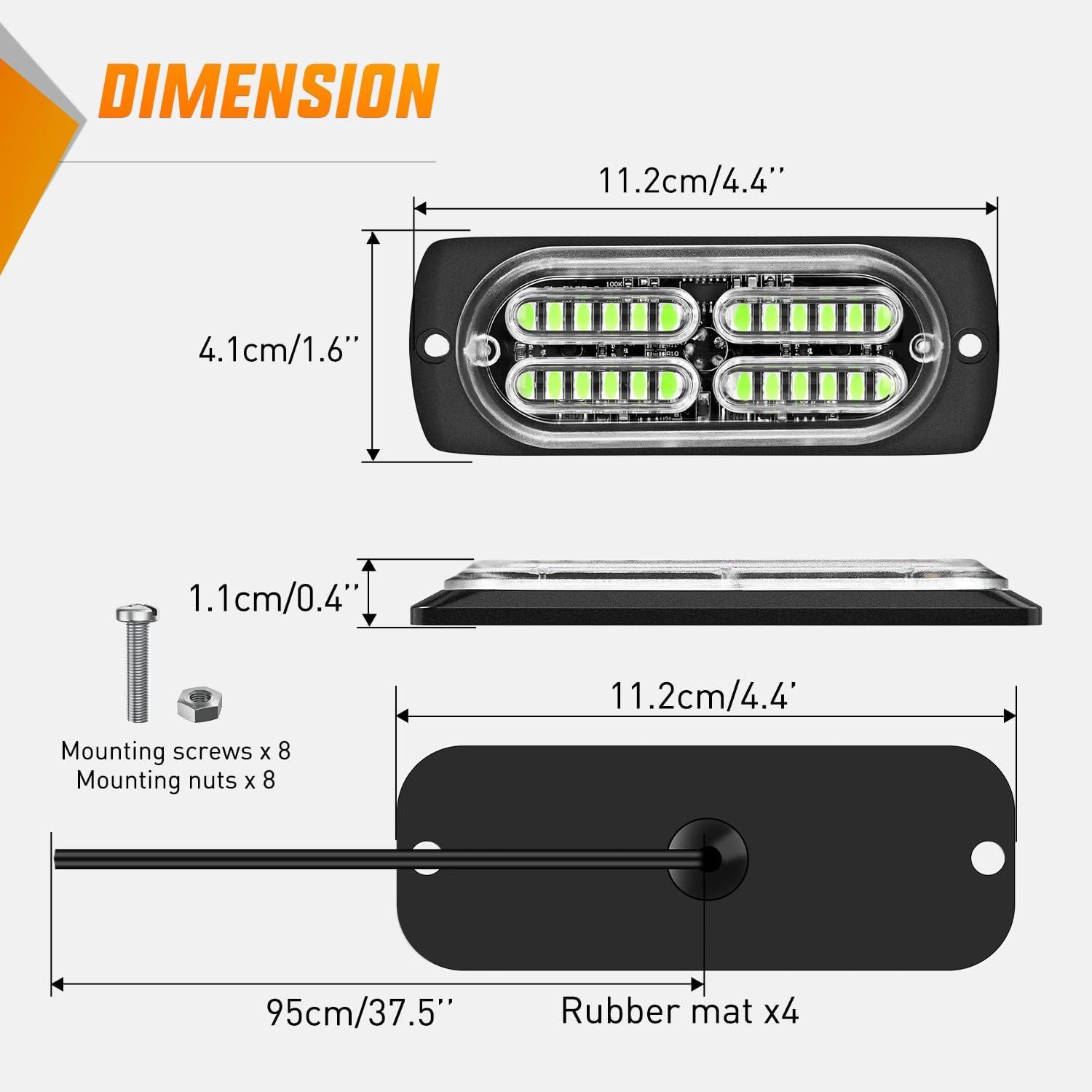 Applications: This strobe light is suitable for any 12-24V vehicle such as trucks, construction vehicles, tractors, snowplows, SUVs, campers, trailers etc. It can be mounted on any surface of the car such as the sides, grille in front of the vehicle, and rear of the car. Package includes: 4pcs LED Strobe Lights, 4pcs Rubber Mats, 8x Mounting Screws