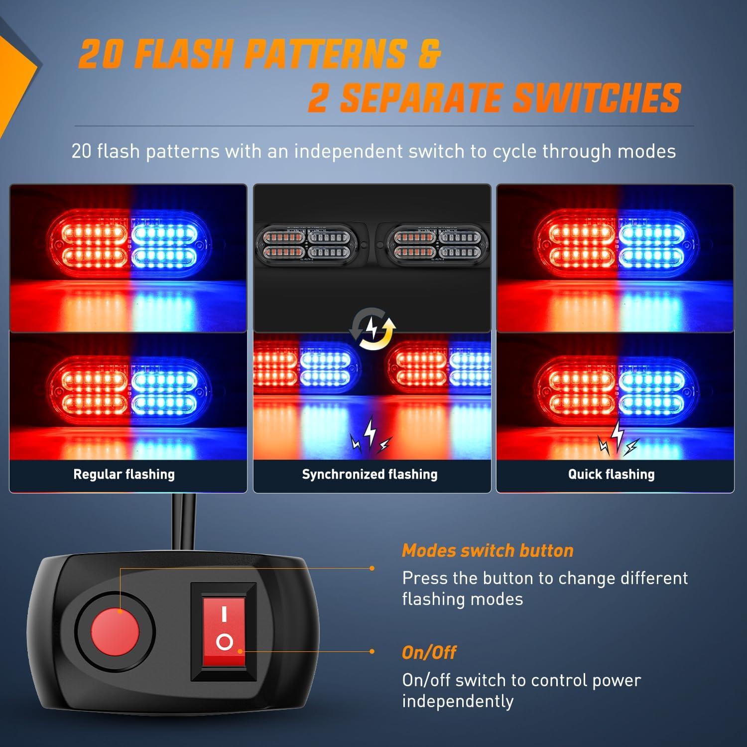 Nilight 4PCS 24LED Emergency Strobe lights 12V 24V Amber Surface Mount Grille Hazard Safety Warning Light Sync Feature Side Flashing Marker Flash for Car Truck Campers(Red Blue w/Controller)