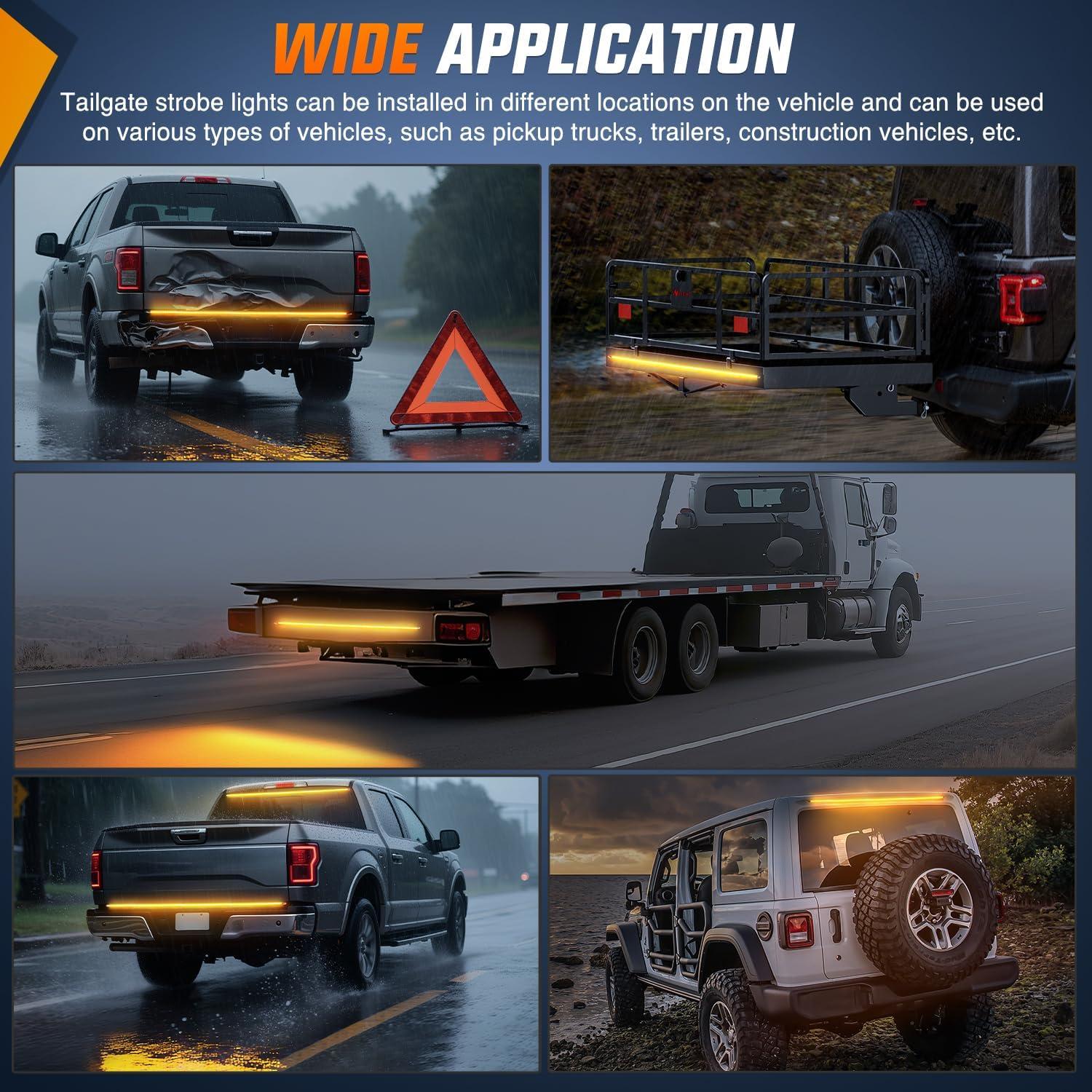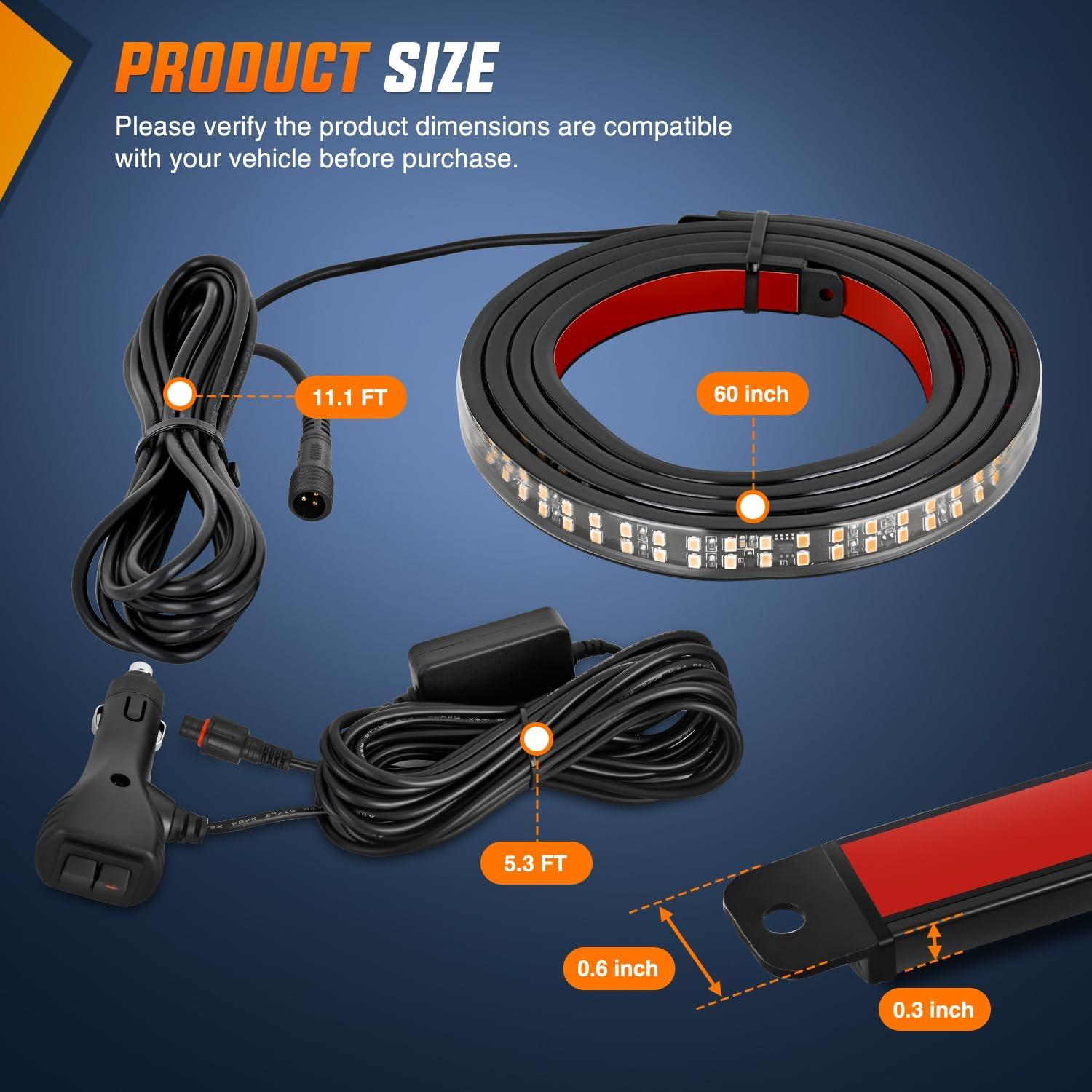 【Wide Application】 The 60 inch tailgate strobe light can be widely used as a safety emergency warning light for hazard warning, first responder, construction vehicles, law enforcement emergency vehicles and tow trucks, police, ems, security, snowplow, postal workers, off-road, SUVs, trucks, cars, pickups, tractors, snowplows, RVs, vans, trailers, etc, providing road safety for you and other drivers
