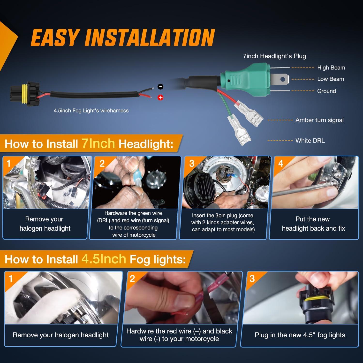 【Plug and Play】 Comes with a mounting bracket ring and other hardware needed, plug & play design for easier installation, usually just plug the headlight and fog lights for the most motorcycle models (comes with instruction)