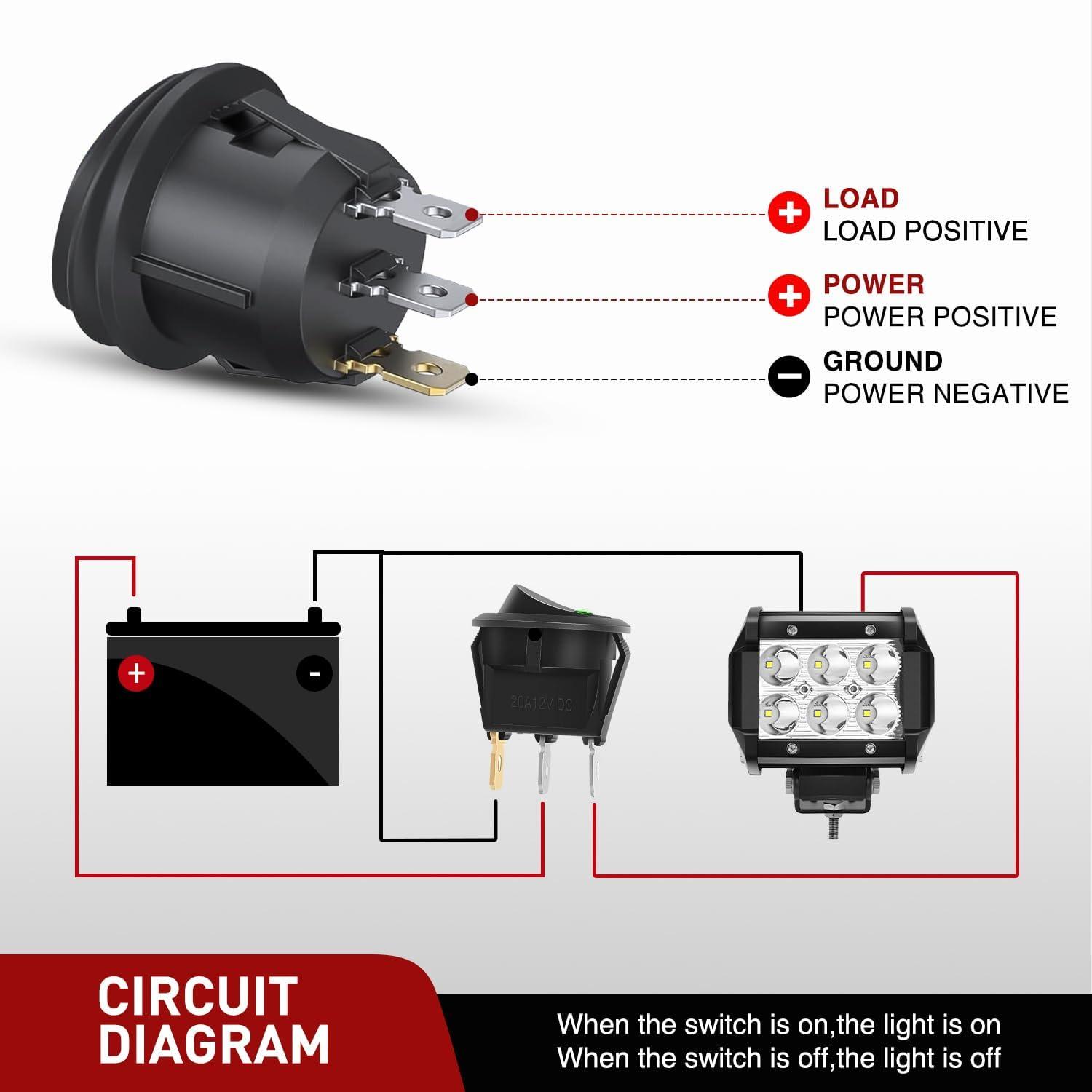 Perfect Design: Designed to connect and disconnect a DC12V 20A electrical circuit at will, SPST: ON-OFF control; 2 pole design (On/Off), 3rd poles with LED to be connected to earth. Fluorescent lamps will be lighted up when the switch is turned on
