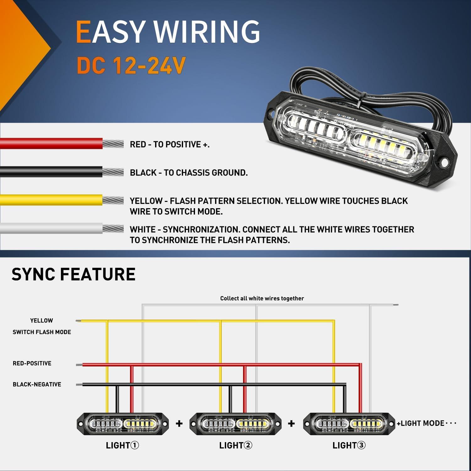 Easy to Install: Upgrade design, this emergency strobe lights with main control box for free wiring installation, it can perfectly synchronized your lights. 11.48FT long wire of each raw of light can meet the installation needs of various large vehicles. Protective mounting gaskets and screws are included for easy installation.