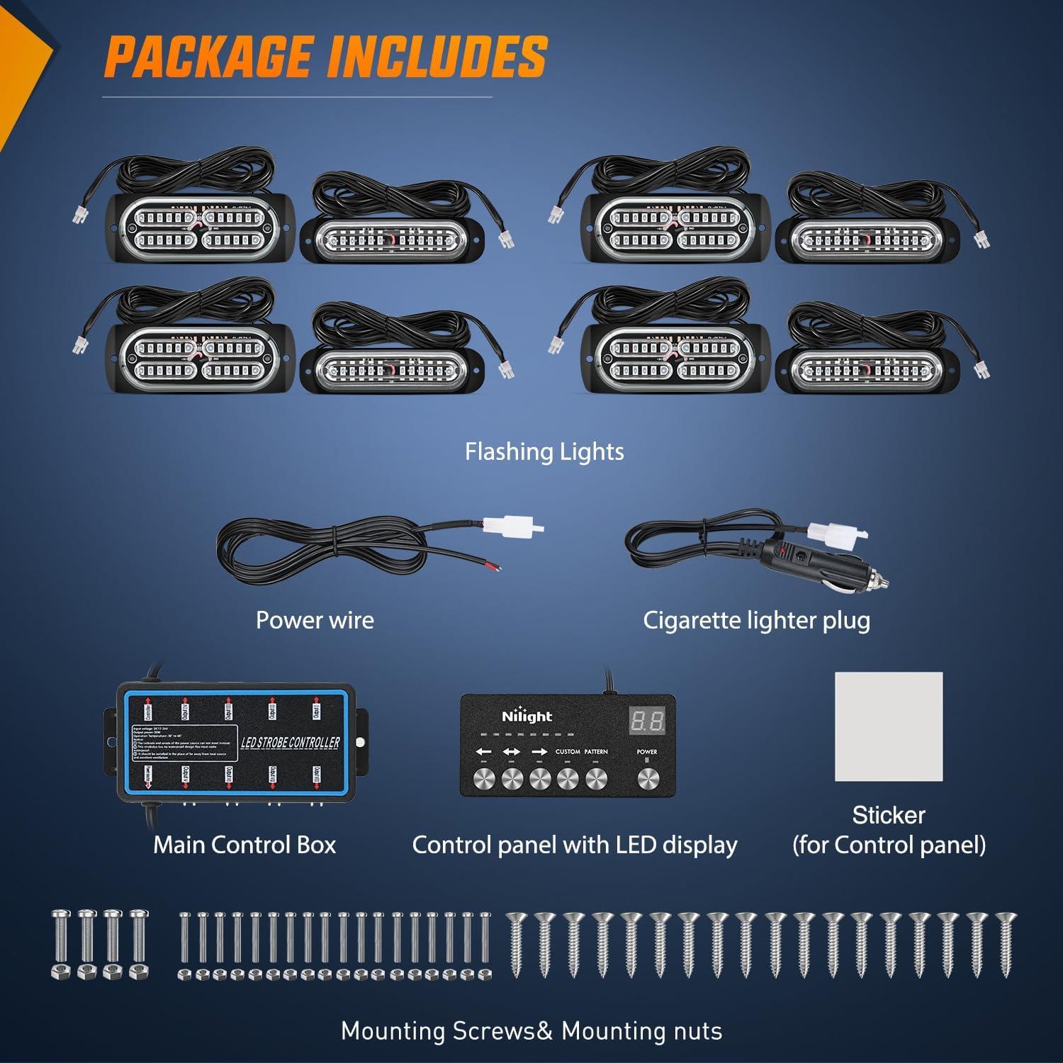 Nilight 8PCS LED Strobe lights 12V Sync Feature Amber White 12 24LED Emergency Hazard Warning Lights with Controller for Cars Trucks RVs Campers, 2 Years Warranty(Blue)