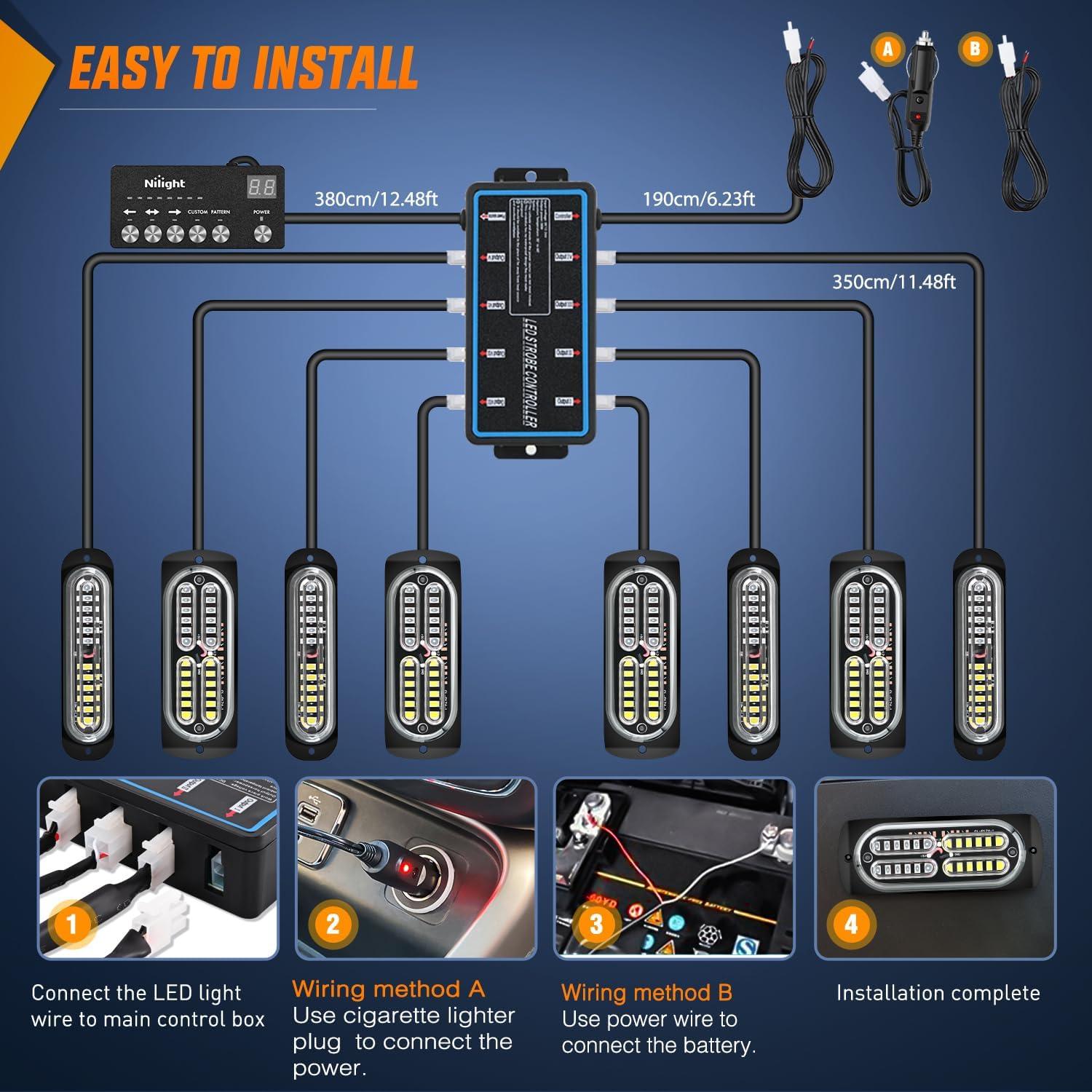 Super Bright: Nilight 8Pcs Surface Mount Strobe Lights are consists of 4pcs single row 12 LED chips and 4pcs double row 24 LED chips. provided maximum illuminate coverage and be visible from greater distance. Visible in daylight, midnight, rainy, foggy or snow days.