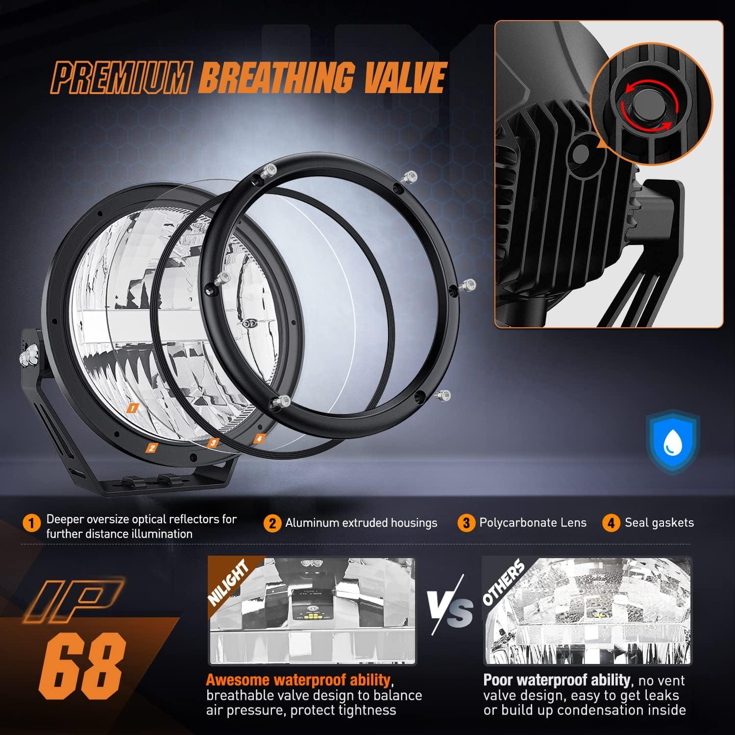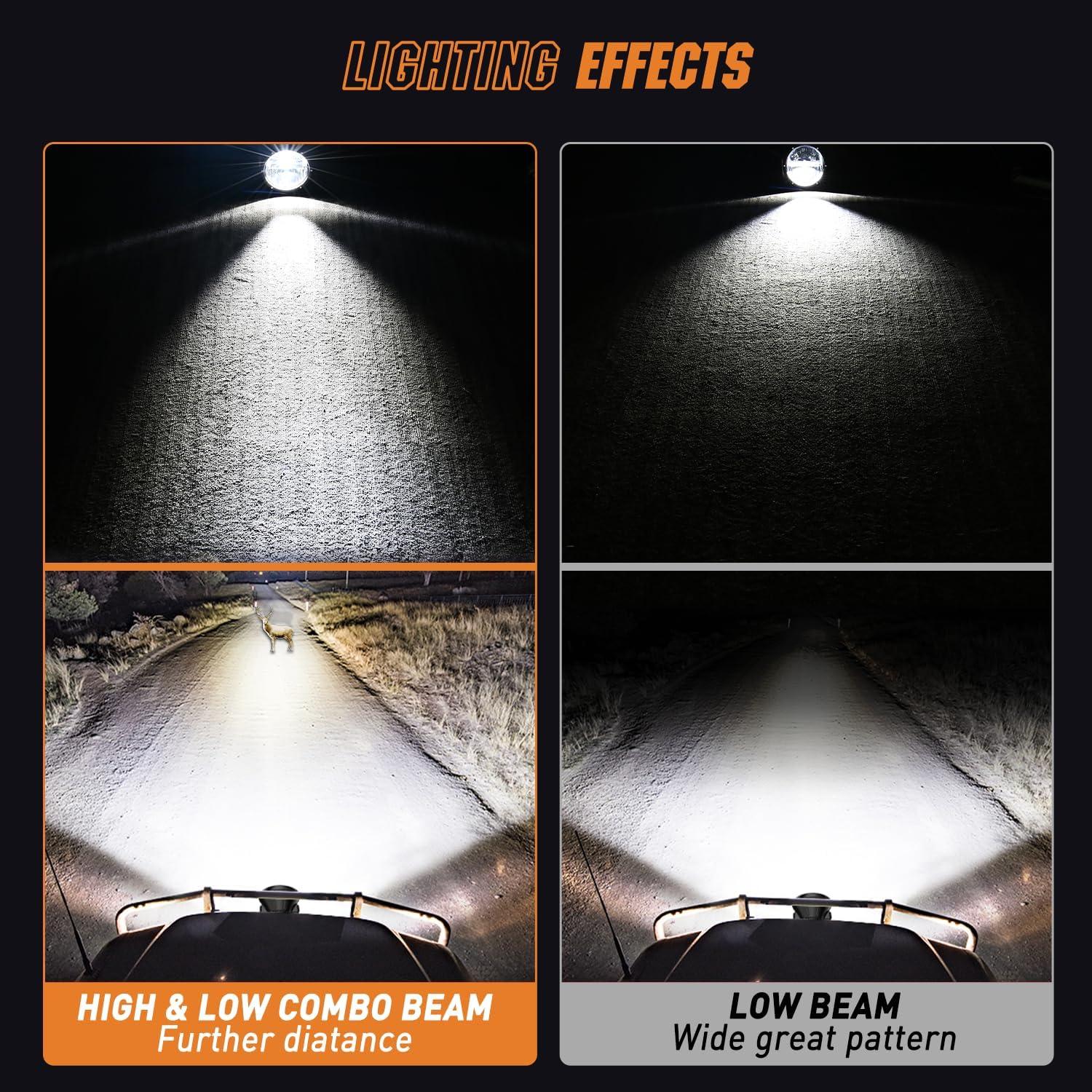 【High Low Beam Design】The 9Inch Round Offroad LED Light have low beam, high low combo beam two light modes. The 33W low beam output on 3500lm, 176Meter@1LUX, 10Meter@310LUX. The 65W high low combo beam output on 7000lm, 305Meter@1LUX, 10Meter@930LUX, provides further and wider visibility for you to see the deer, wild animals, falling rocks or obstacles in advance to ensure safer driving at night