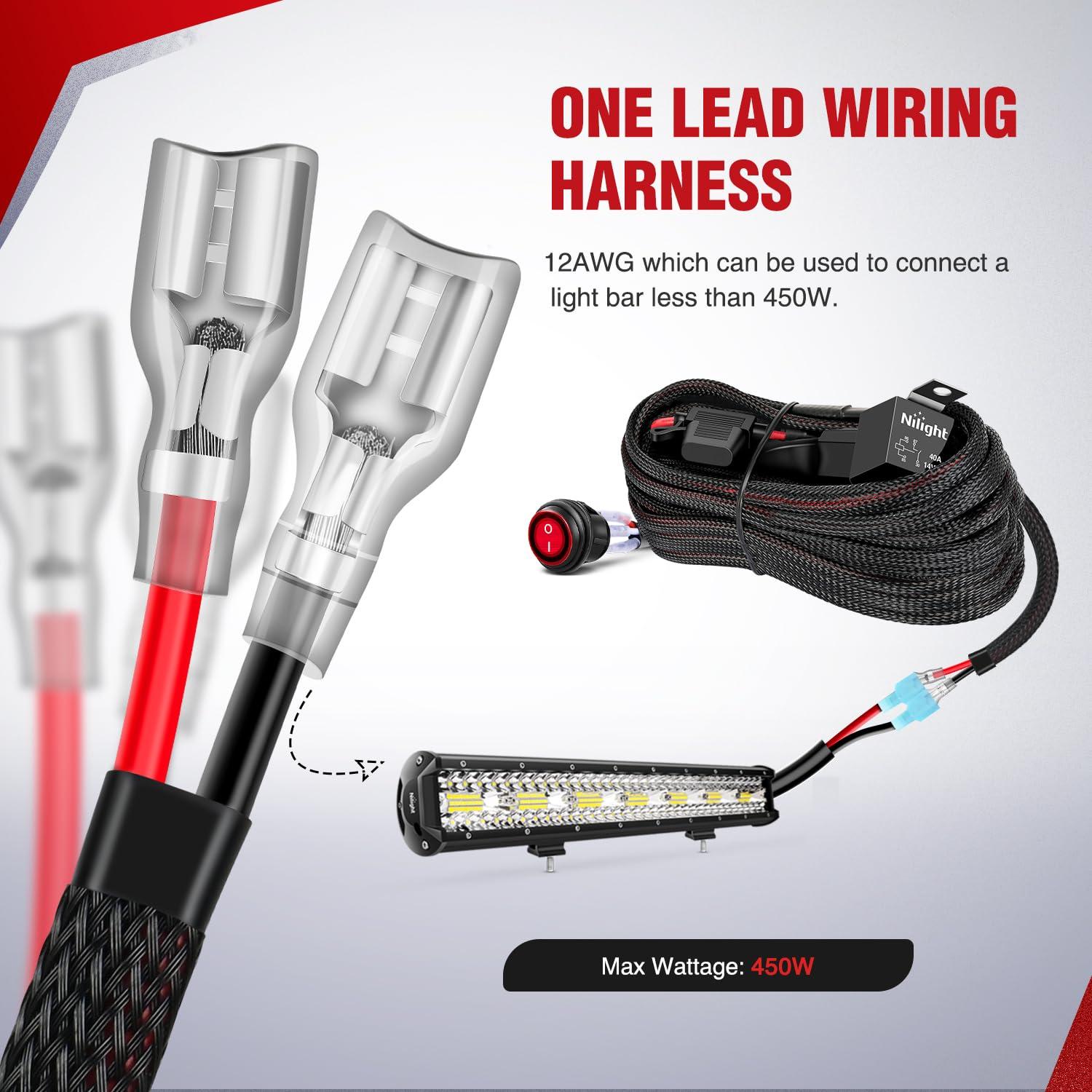 Nilight Copper LED Light Bar Wiring Harness Kit – 1 Lead 12AWG Heavy Duty 12V On Off Switch Power Relay Blade Fuse for Off Road LED Work Light,2 Years Warranty(12AWG-2 Lead)