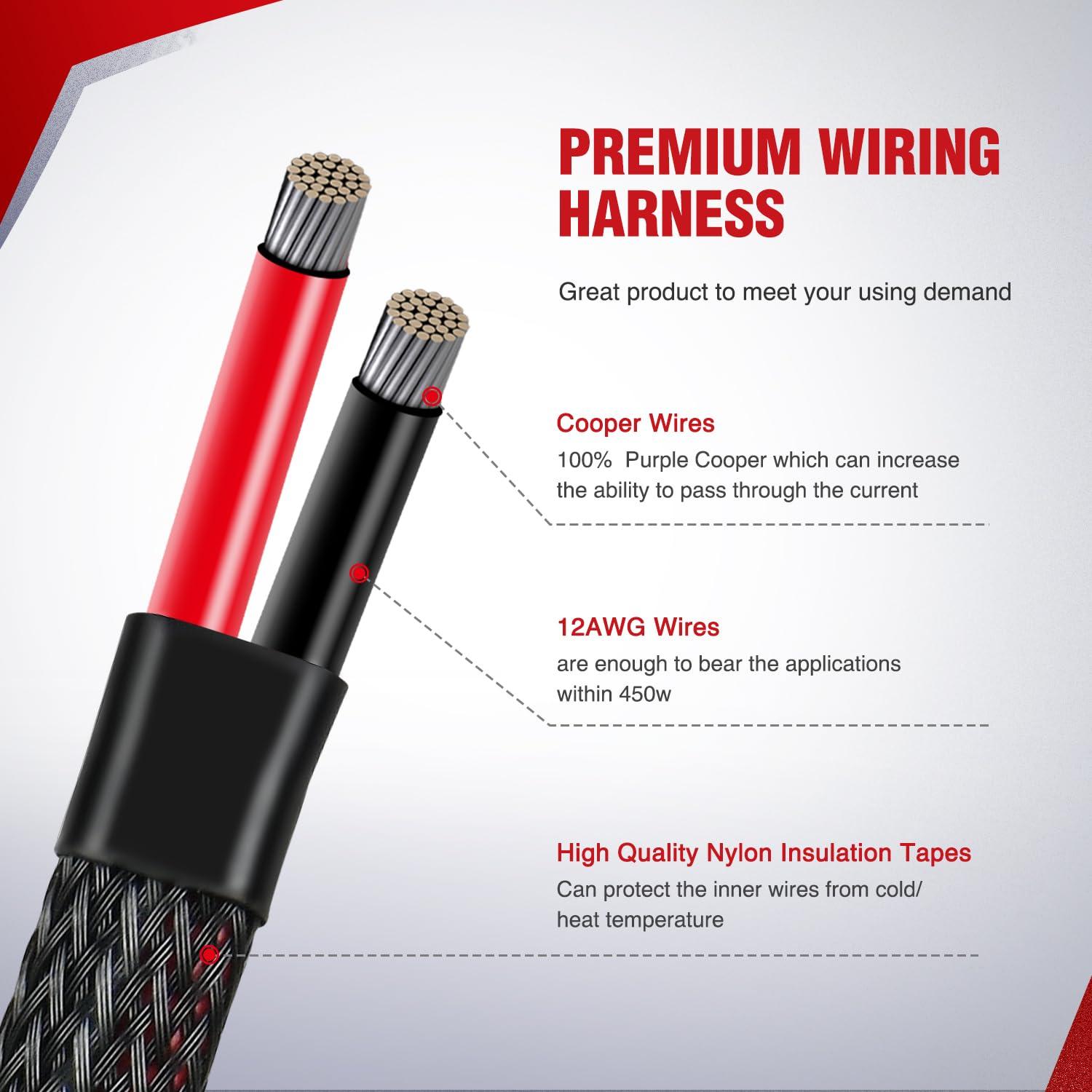 10 feet harness: 10ft heavy-duty harness, 12AWG stranded wire, up to 450W load capacity, the length from relay to switch is extendable