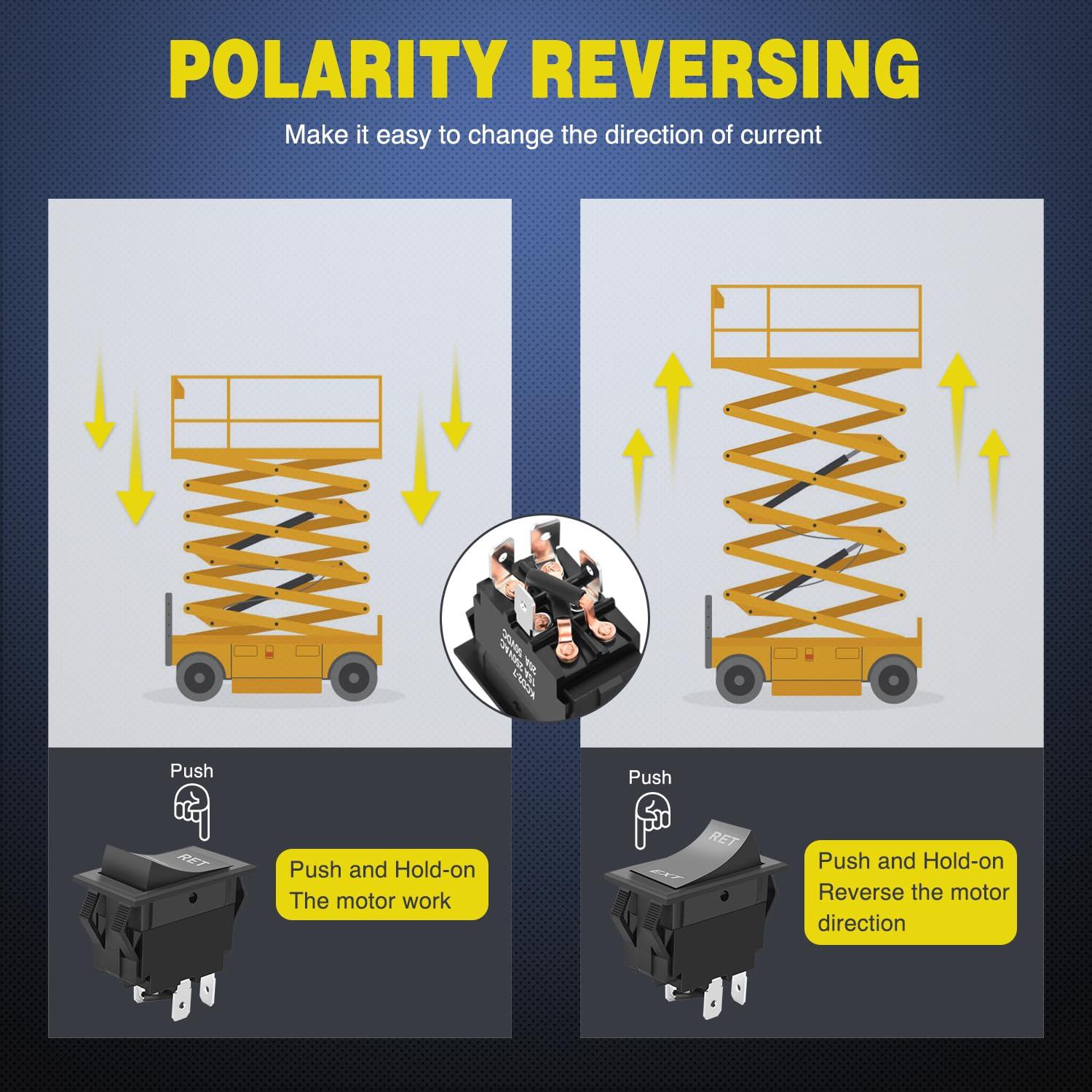 Momentary Switch: Heavy duty DPDT reverse polarity switch resetting automatically (returns to off) when released. Controls the up/down, clockwise/counterclockwise motion of DC loads (e.g. motors, hoists, cranes, linear actuators etc.).