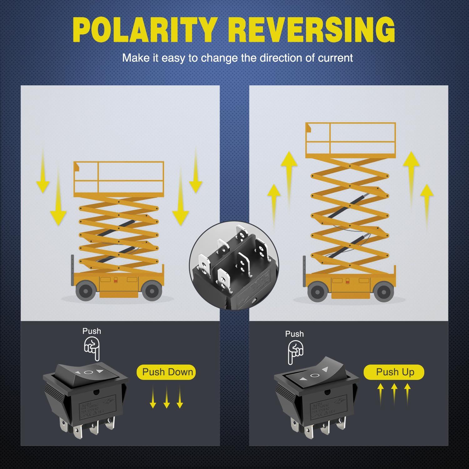 Momentary Switch: Heavy duty DPDT reverse polarity switch resetting automatically (returns to off) when released. Controls the up/down, clockwise/counterclockwise motion of DC loads (e.g. motors, hoists, cranes, linear actuators etc.).