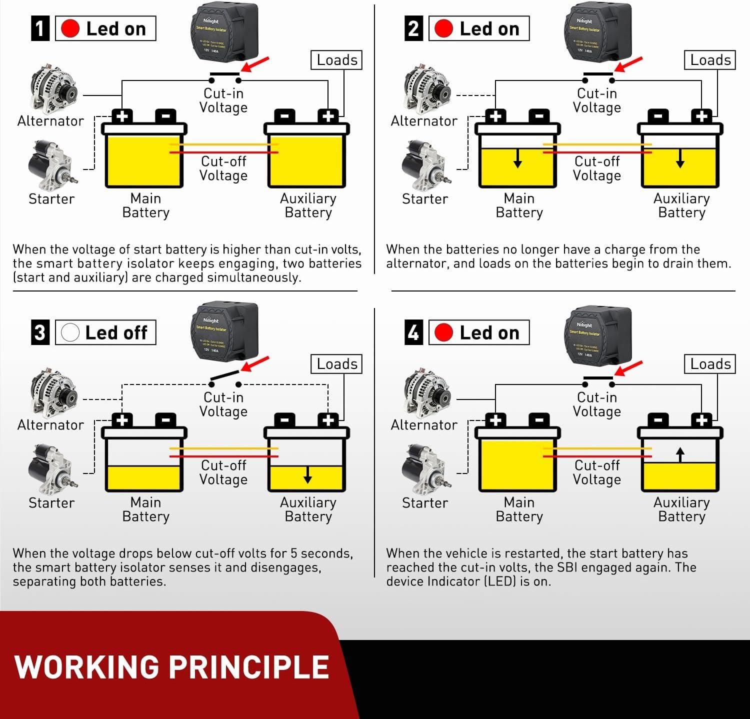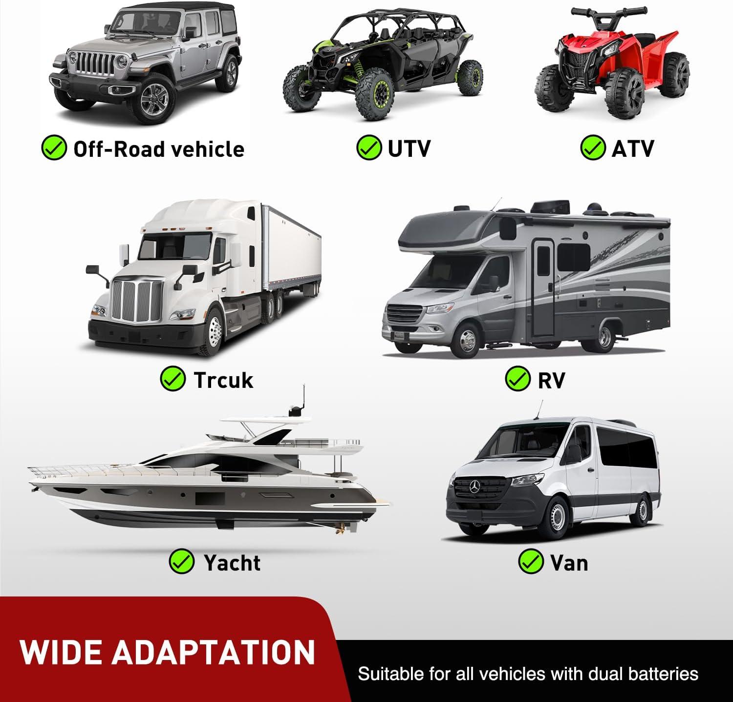 Wide Application: Designed for 12V dual battery systems(compatible with lithium batteries); allows two power sources to charge from one alternator without battery drain concerns. Suitable for 12v camper van trucks, caravans, RV, ATV, UTV, Boat and camping applications