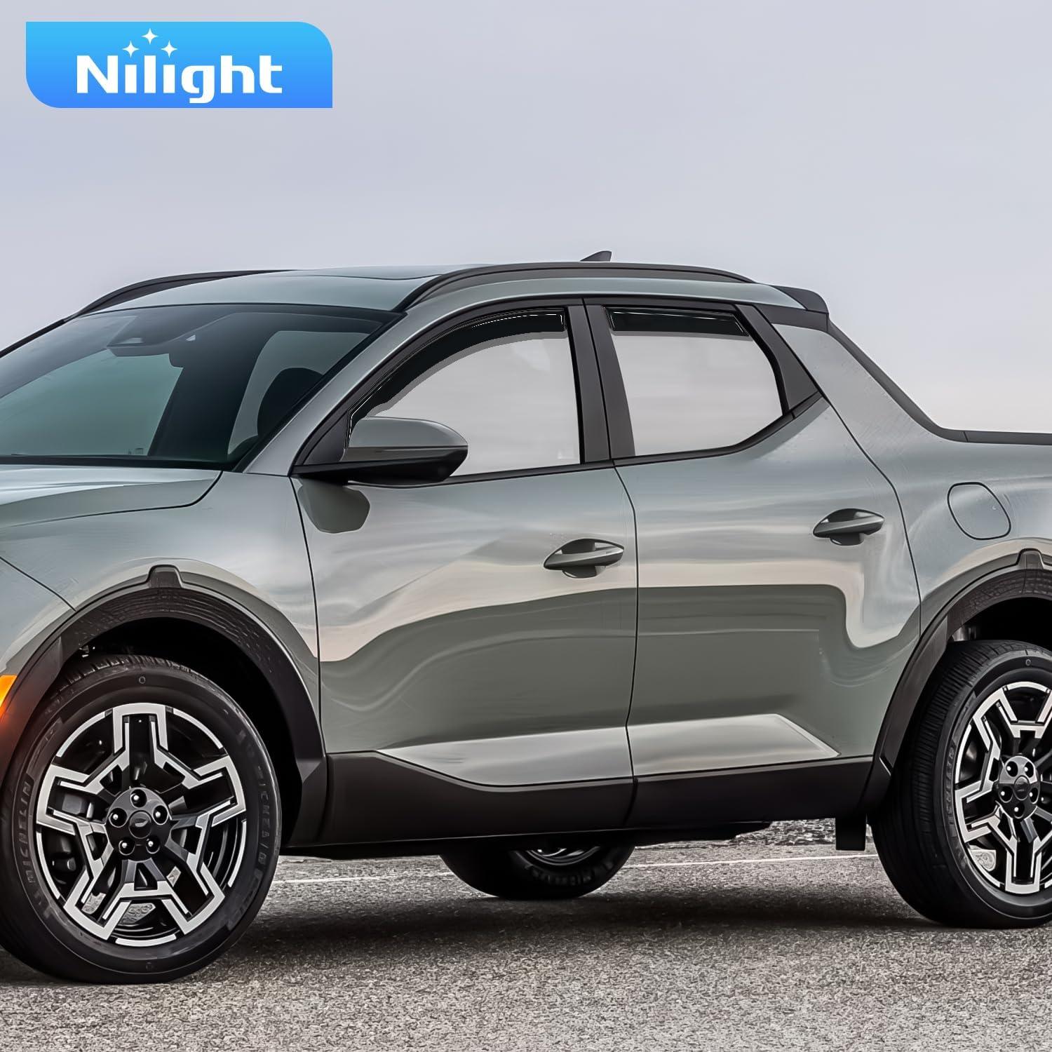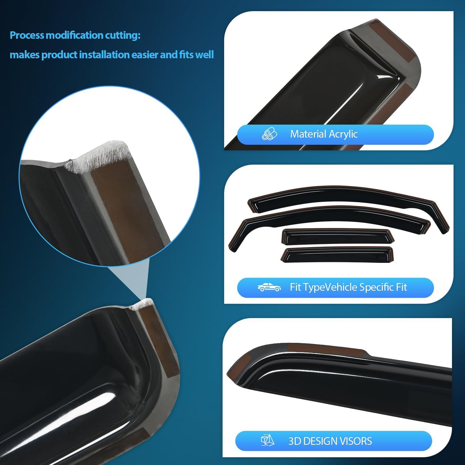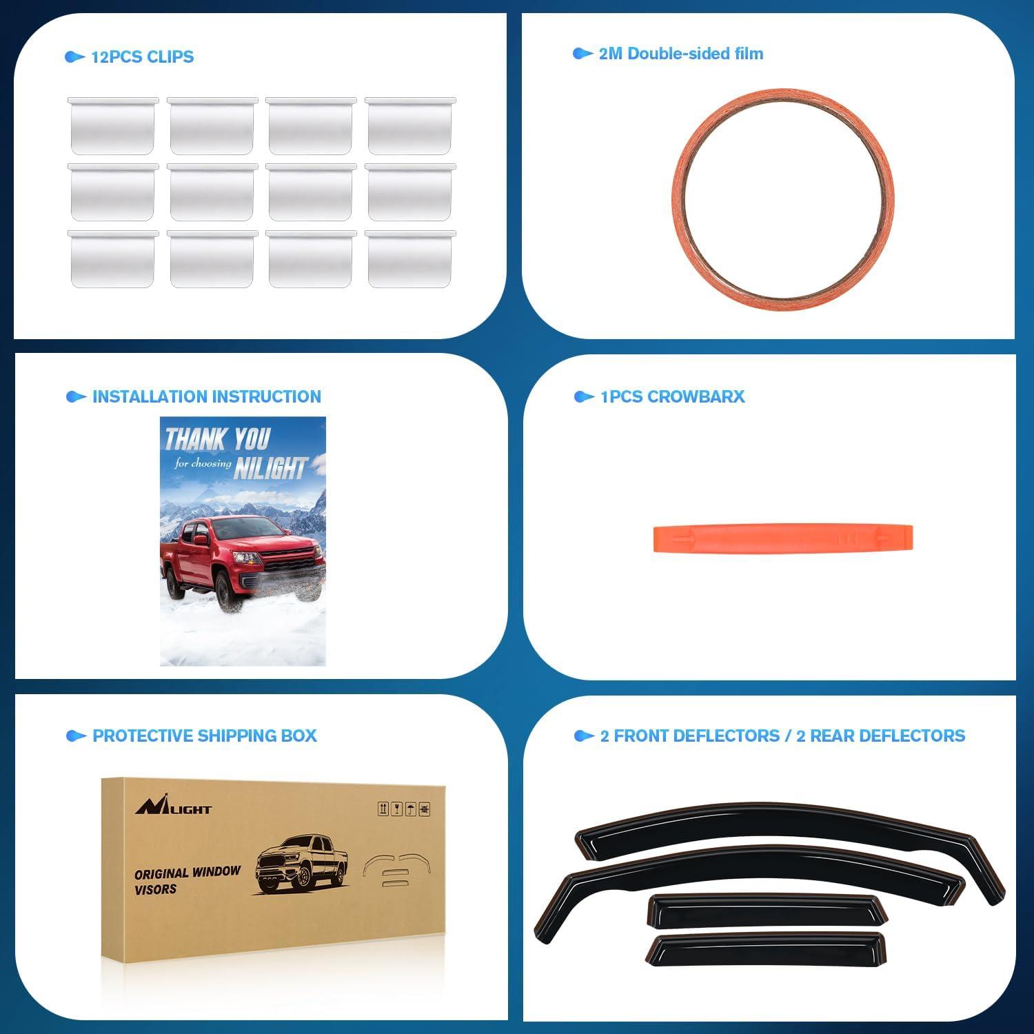 Advantage:Nilight window deflectors are great for all weather conditions,help improve ventilation inside and outside your car to reduce mirror and window fogging while increasing air circulation。With our side window deflectors, it deflects the rain and noise away from your windows to make your driving more enjoyable