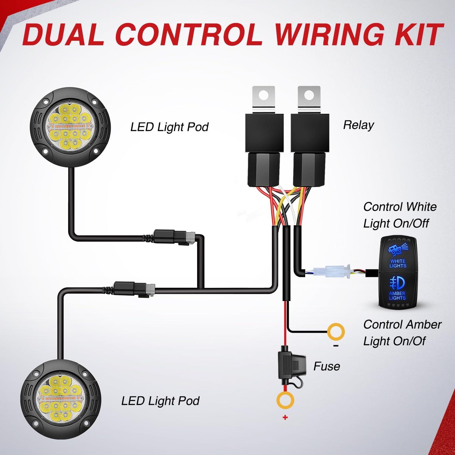 Upgraded Dual Control Rocker Switch: Comes with an 18AWG kit (relay, fuse, wires included—no extra parts needed). The newly upgraded dual-control power rocker switch features two button colors, making it easier for you to control LED lights at night