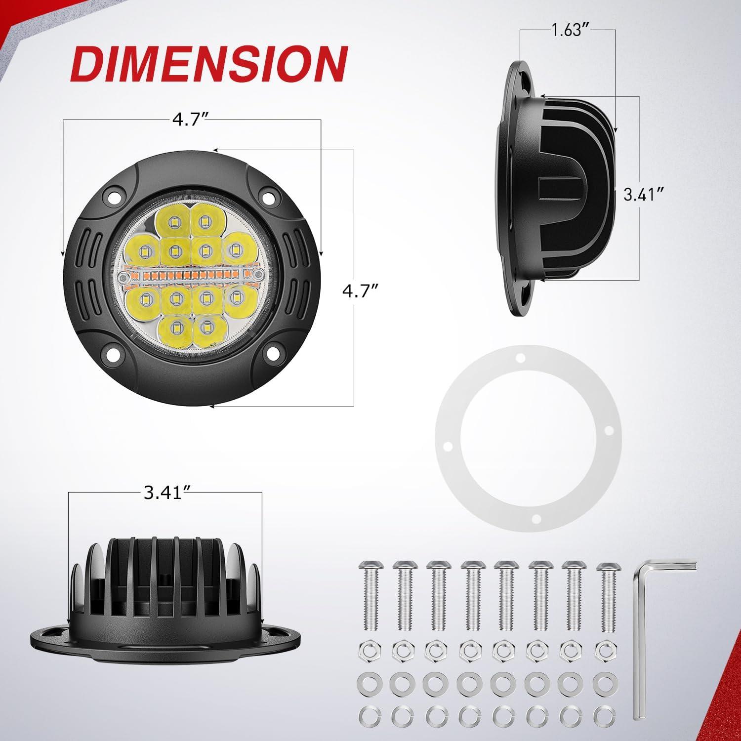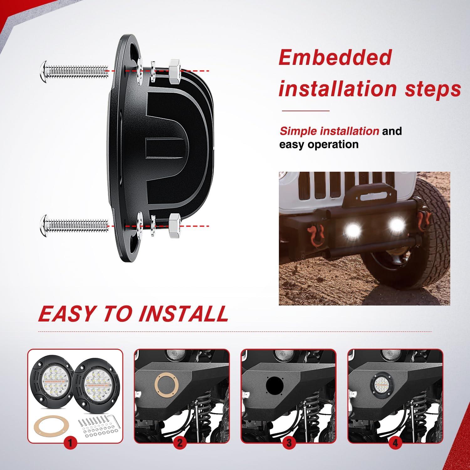 Wide Application: Flush mount light pods can be perfectly mounted on rear bumper or grill.Works with 9-30V DC (wiring harness fits 12V vehicles). Compatible with Jeeps, trucks, SUVs, ATVs/UTVs, tractors, boats, and golf gart—covers daily drives and outdoor adventures