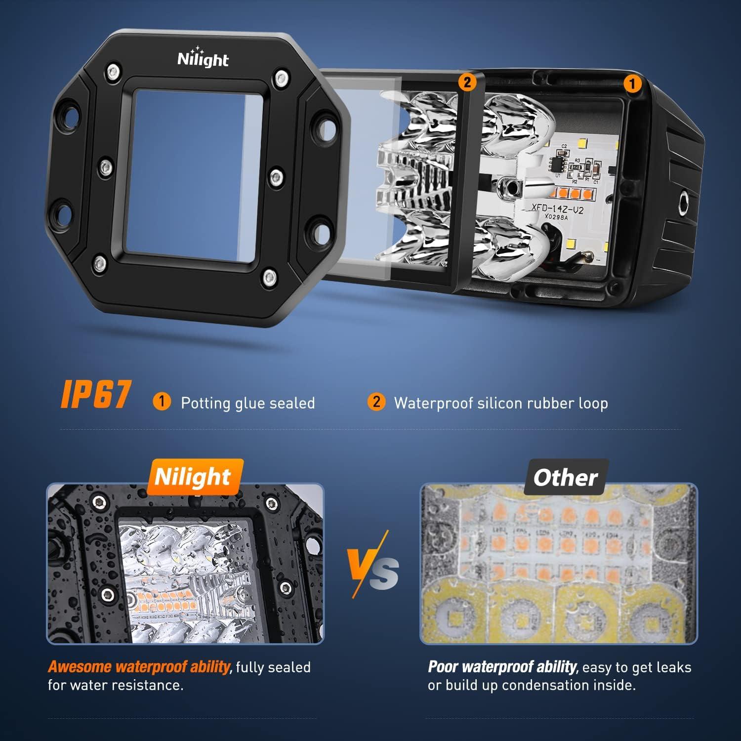 imageNilight Flush Mount LED Light Pods 2PCS 6 Inch 39W Amber White 3 Lighting Modes Fog Lights Spot Flood Beam with Dual Control 18AWG Wiring Harness for Truck Pickup Golf Cart UTV ATV SUV Boat 4x4 CarAmberWhite 3 Modes 62x34 Rectangular