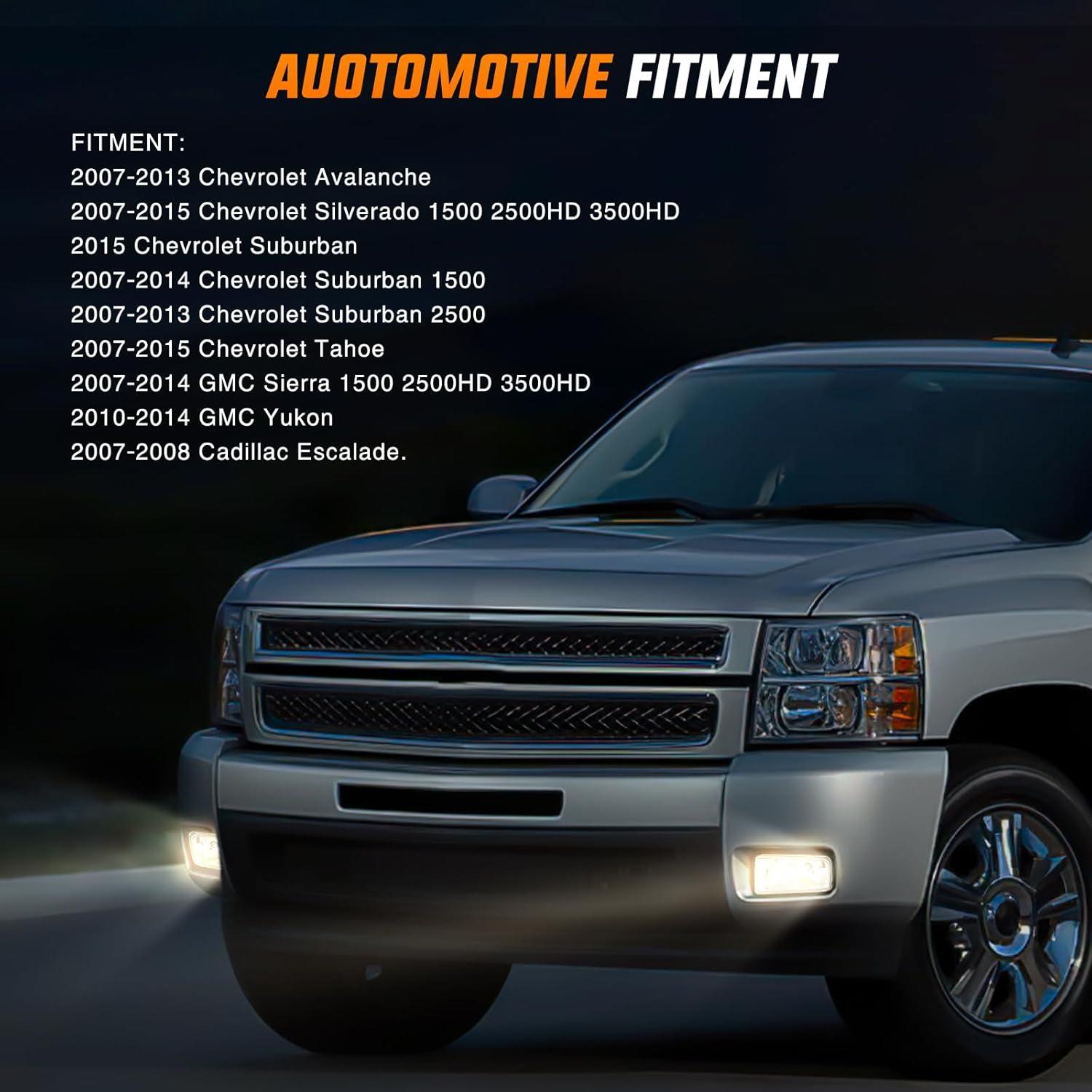 Vehicle Fitment: The fog lights are compatible with 1999-2002 Chevy Silverado 1500 2500, 2001-2002 Chevy Silverado 3500, 2000-2006 Chevy Suburban, 2000-2006 Chevy Tahoe. Provide a factory-installed look when installed, without the need for vehicle modifications. Please confirm the vehicle fitment before ordering.
