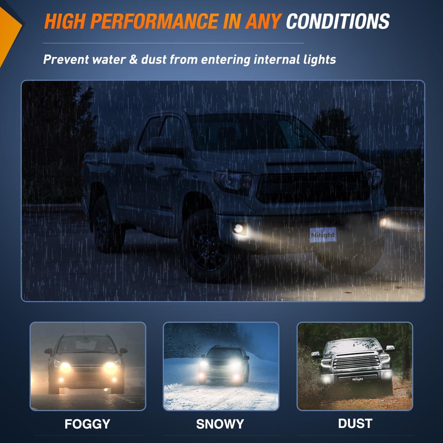 Excellent Visibility: 3300K clear light is more penetrating. Our fog lights provide clearer vision for driving in rainy, foggy, snowy, and dusty weather conditions. Nilight fog light can help you to see the road ahead and be noticed by the oncoming drivers and passersby through the dense fog. Get better visibility and enjoy safe and comfortable driving with our fog lights.