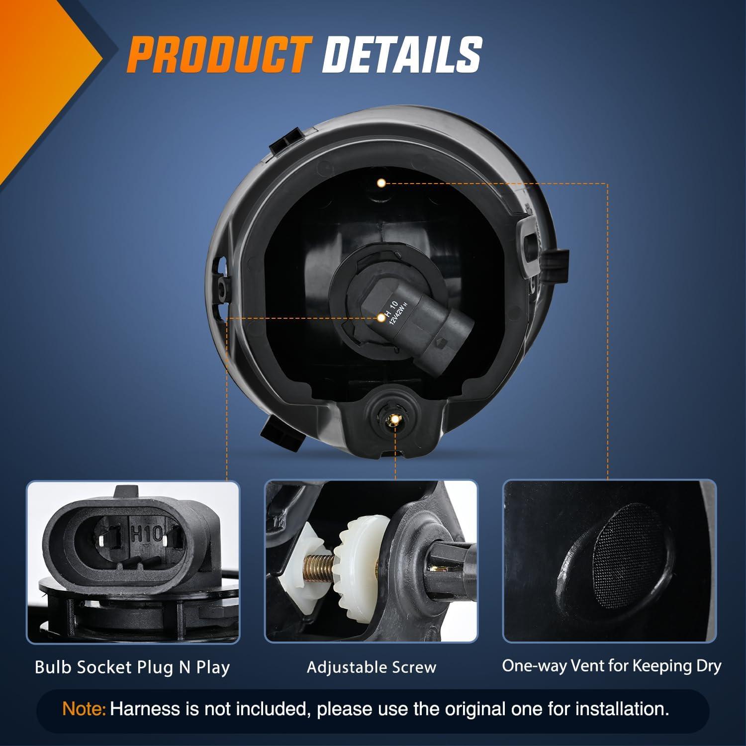 Packages Includes: A pair of fog lights (driver's side and passenger's side) with H10 bulbs. Fog light wiring harness not included. Professional installation is highly recommended.