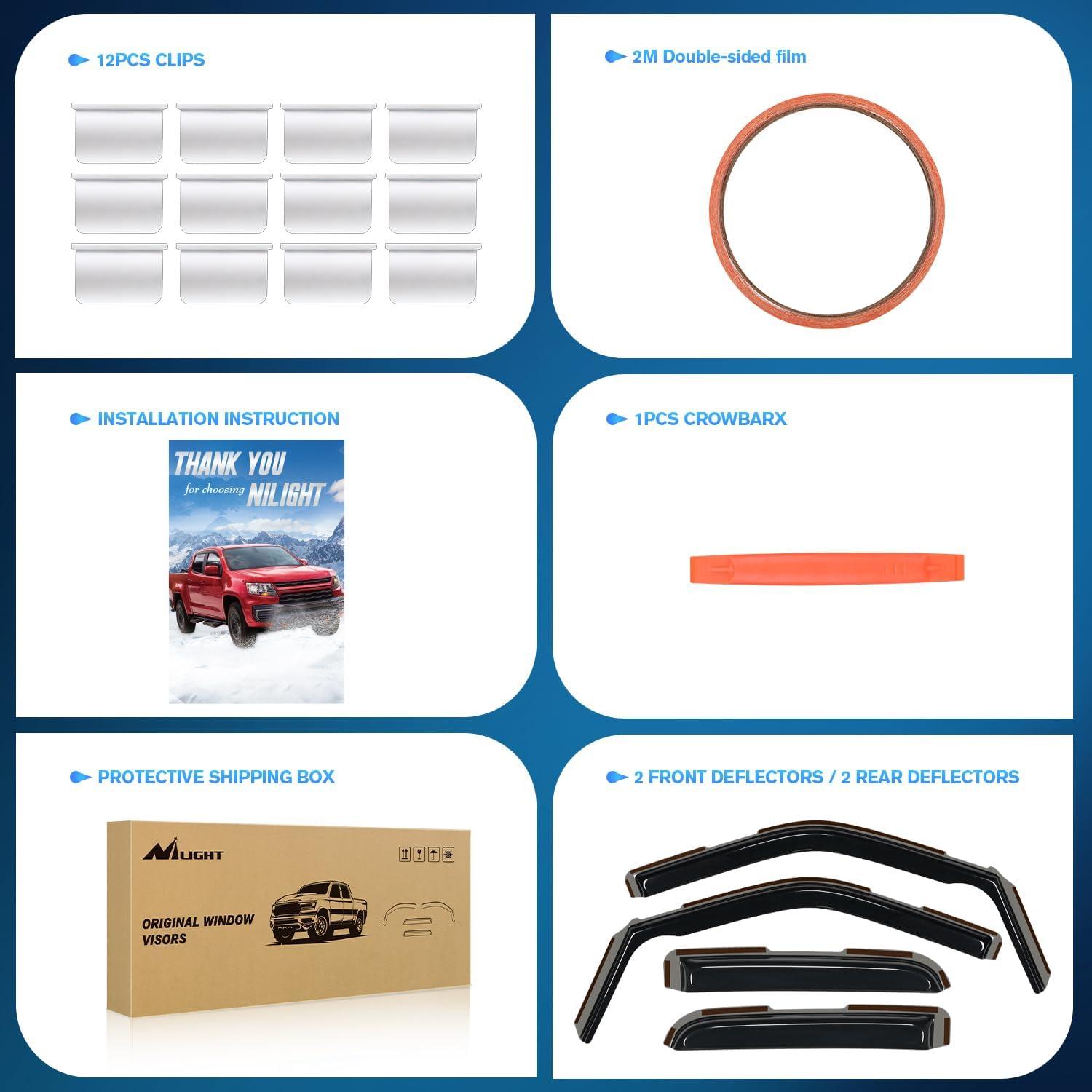 Advantage:Nilight window deflectors are great for all weather conditions,help improve ventilation inside and outside your car to reduce mirror and window fogging while increasing air circulation。With our side window deflectors, it deflects the rain and noise away from your windows to make your driving more enjoyable