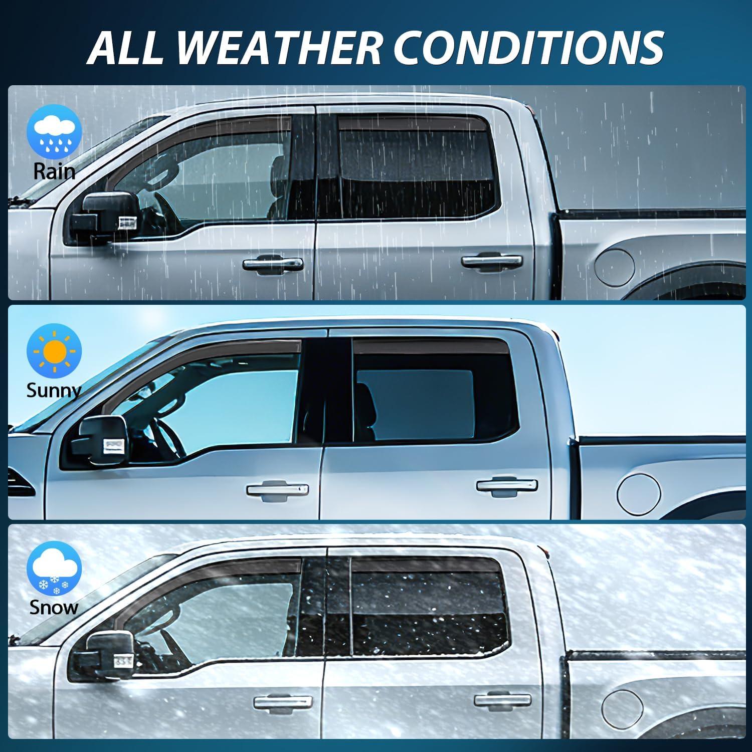 PREMIUM MATERIAL: Made from high-impact, shatterproof acrylic, these window deflectors resist bending, cracking, and breaking.Helps reduce wind noise, minimize rain intrusion, and reduce glare during night driving, allowing fresh air circulation in all weather conditions